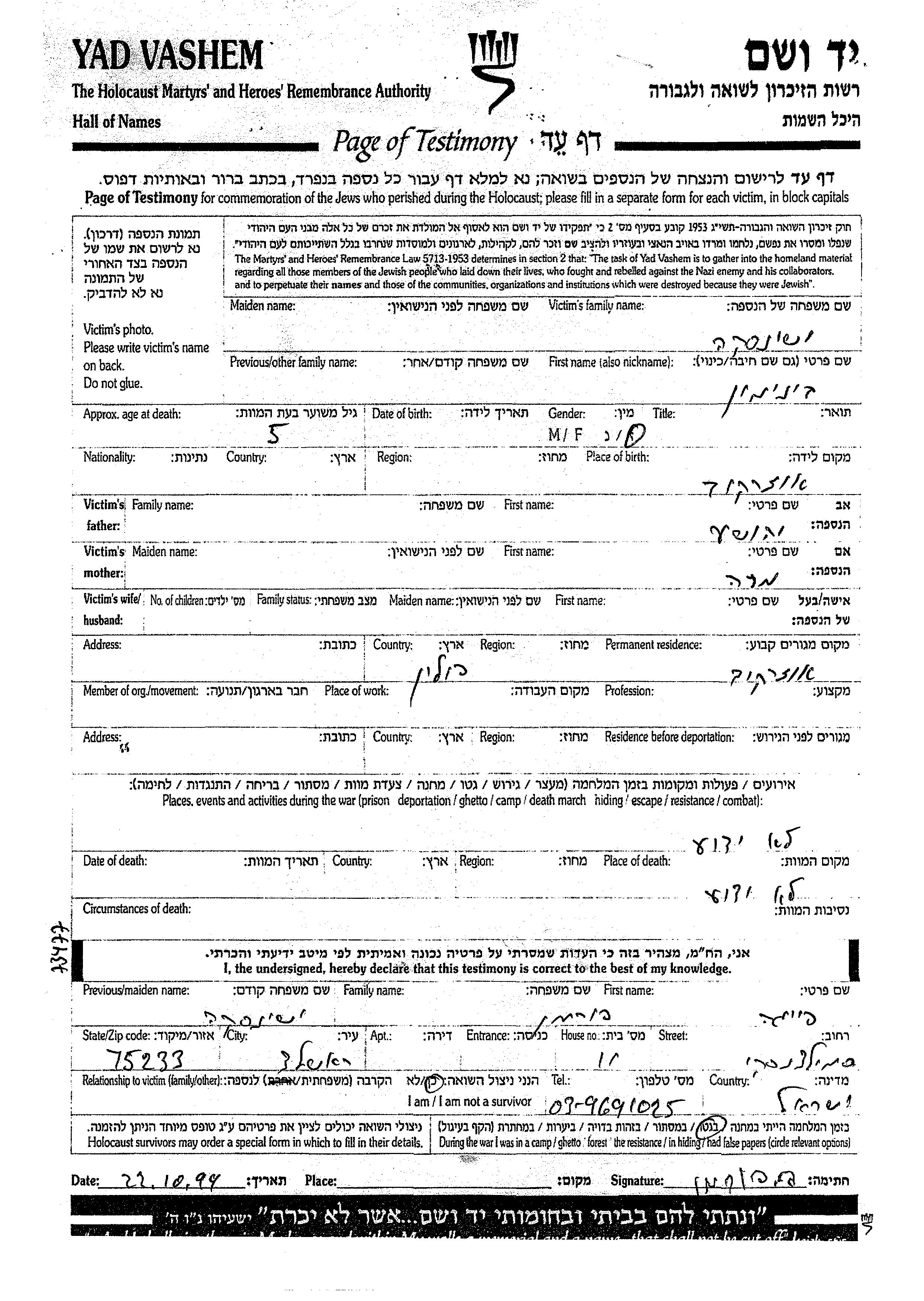 Biniamin Vashinski wurde in Ozorkow, Polen geboren. Er war der Sohn von Yehoshua und Mera. Vor dem Zweiten Weltkrieg lebte er in Ozorkow, Polen.