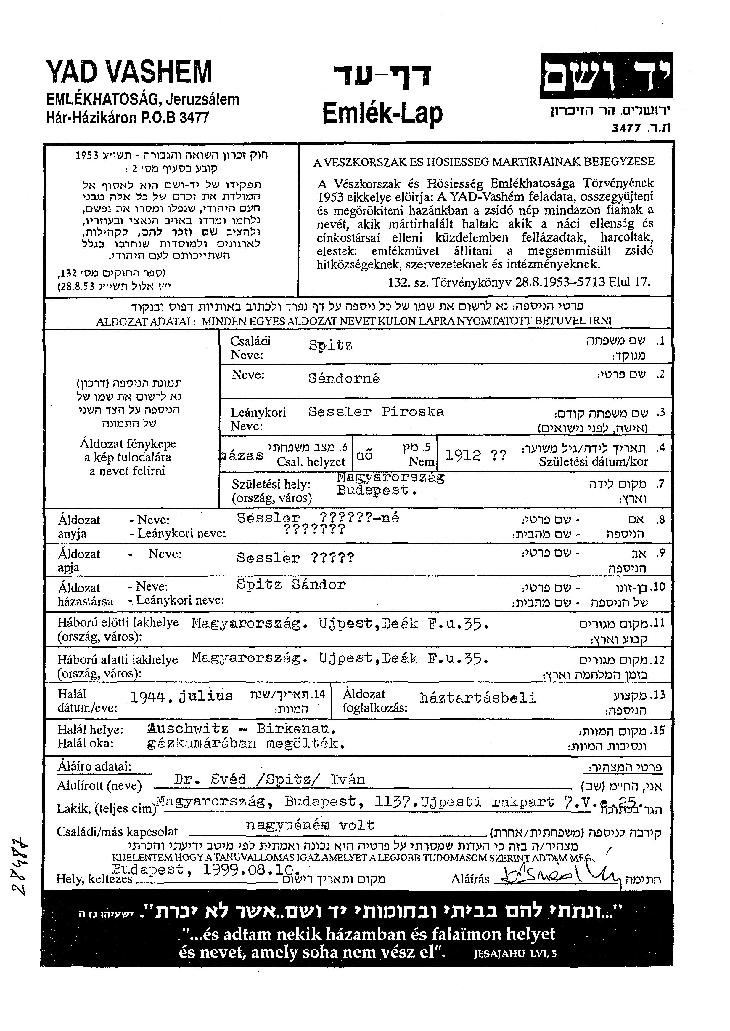 Piroshka Spitz, geb. Sessler wurde im Jahr 1912 in Budapest, Ungarn geboren. Sie war Hausfrau und mit Sandor Verheiratet. Vor dem Zweiten Weltkrieg lebte sie in Ujpest, Ungarn. Während des Krieges war sie in Ujpest, Ungarn.