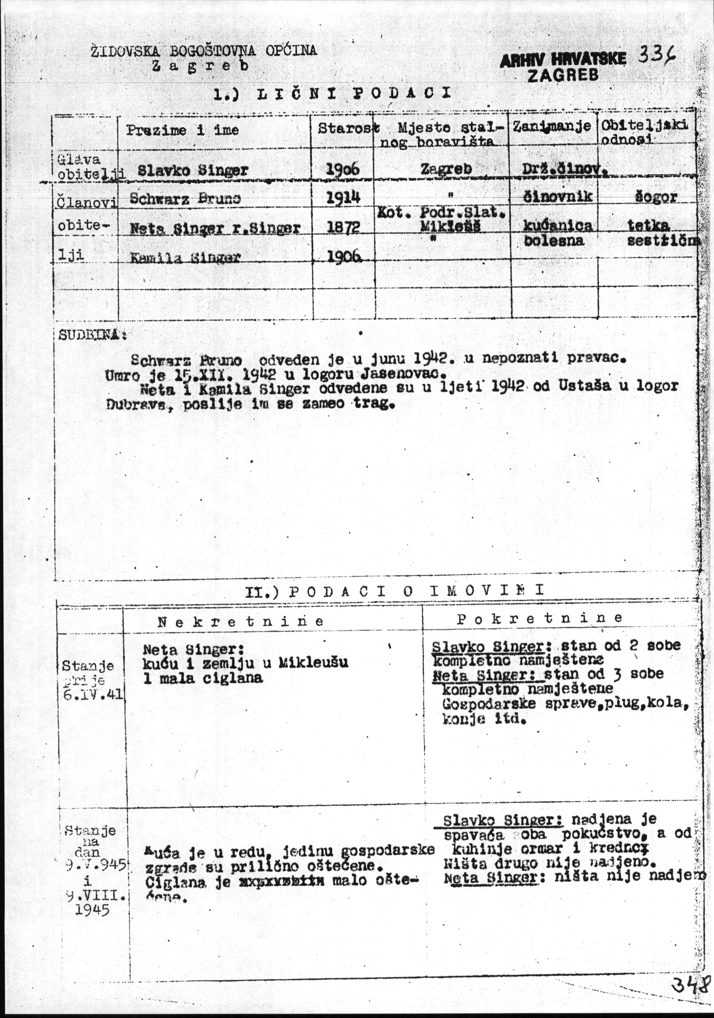 List of Jews from Zagreb and the surrounding area including their fate and details of the damage caused to their property, Letters A-W, 1945
