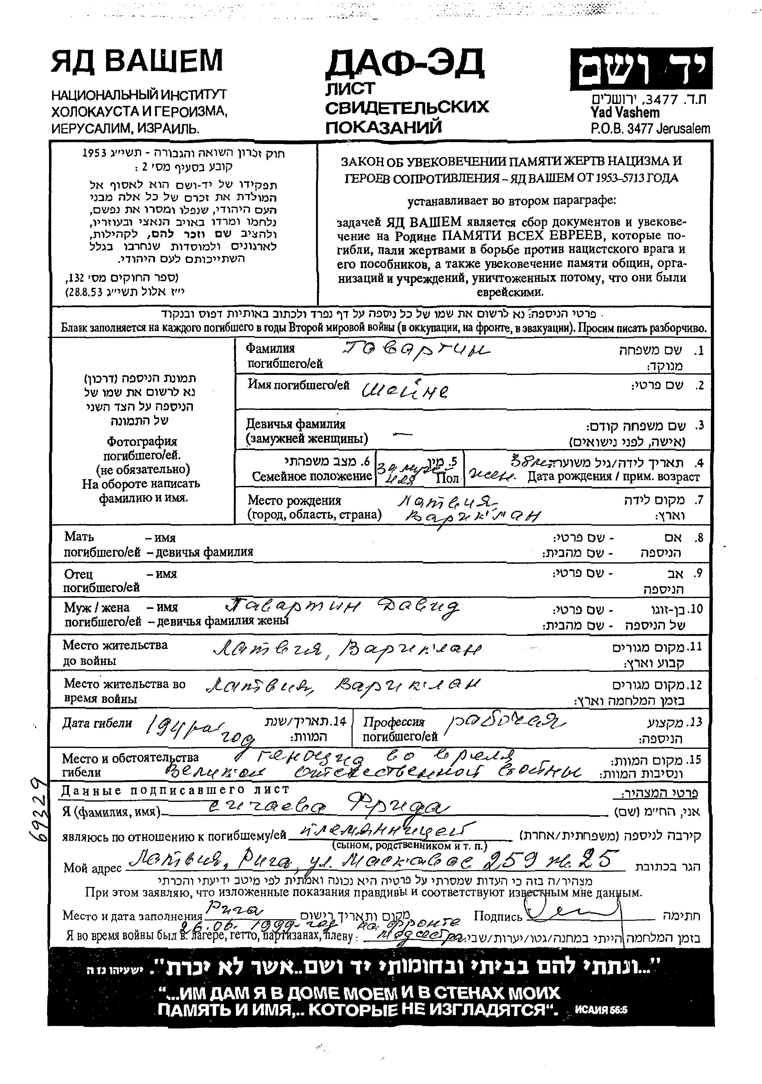 Sheine Gavartin wurde in Varaklani, Lettland geboren. Sie war Arbeiter/-in und mit David Verheiratet. Vor dem Zweiten Weltkrieg lebte sie in Varaklani, Lettland. Während des Krieges war sie in Varaklani, Lettland.