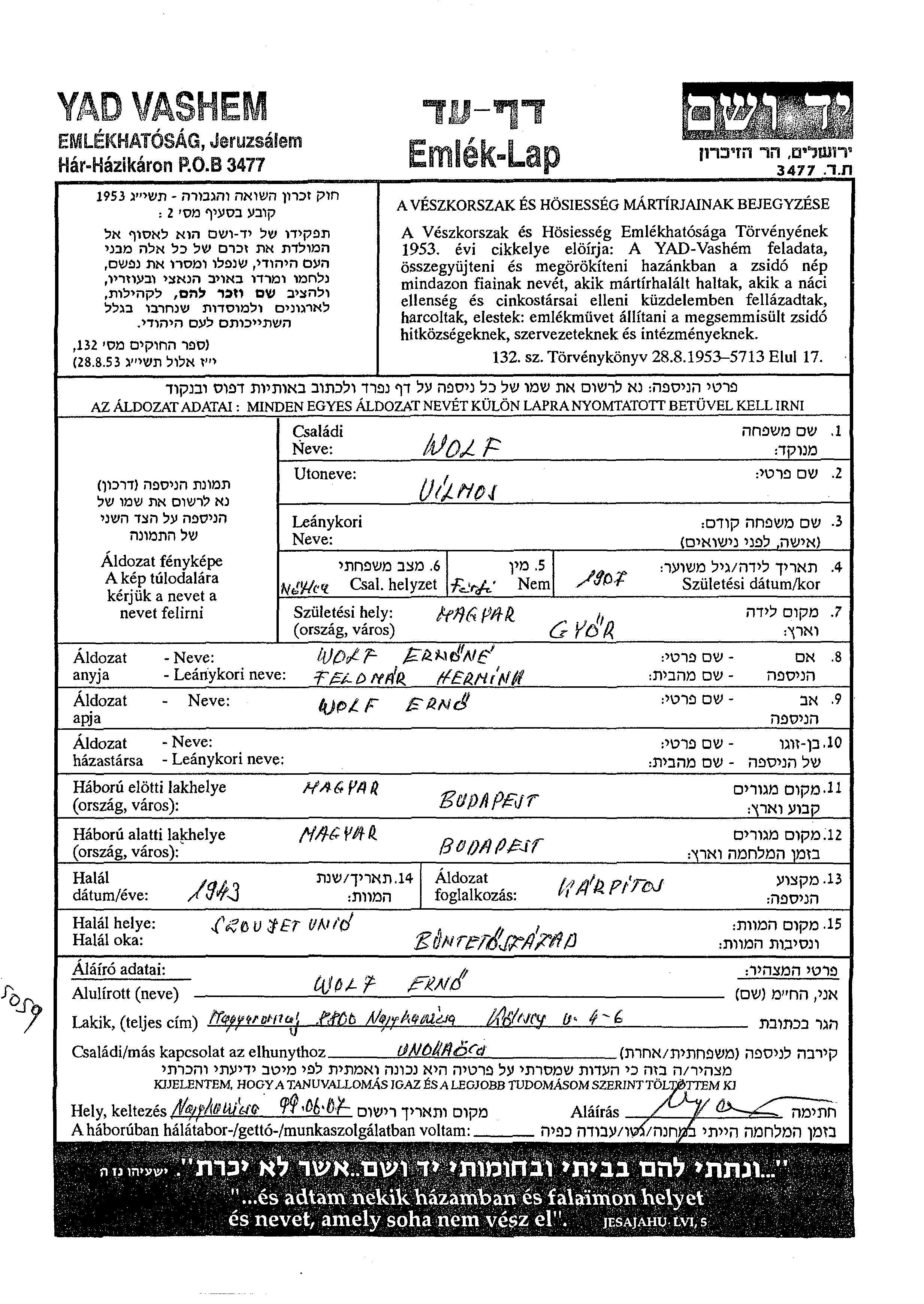 Vilmosh Wolf wurde im Jahr 1907 in Gyor, Ungarn geboren. Er war der Sohn von Erno und Hermina. Er war Polsterer/-in und Ledig. Vor dem Zweiten Weltkrieg lebte er in Budapest, Ungarn. Während des Krieges war er in Budapest, Ungarn.