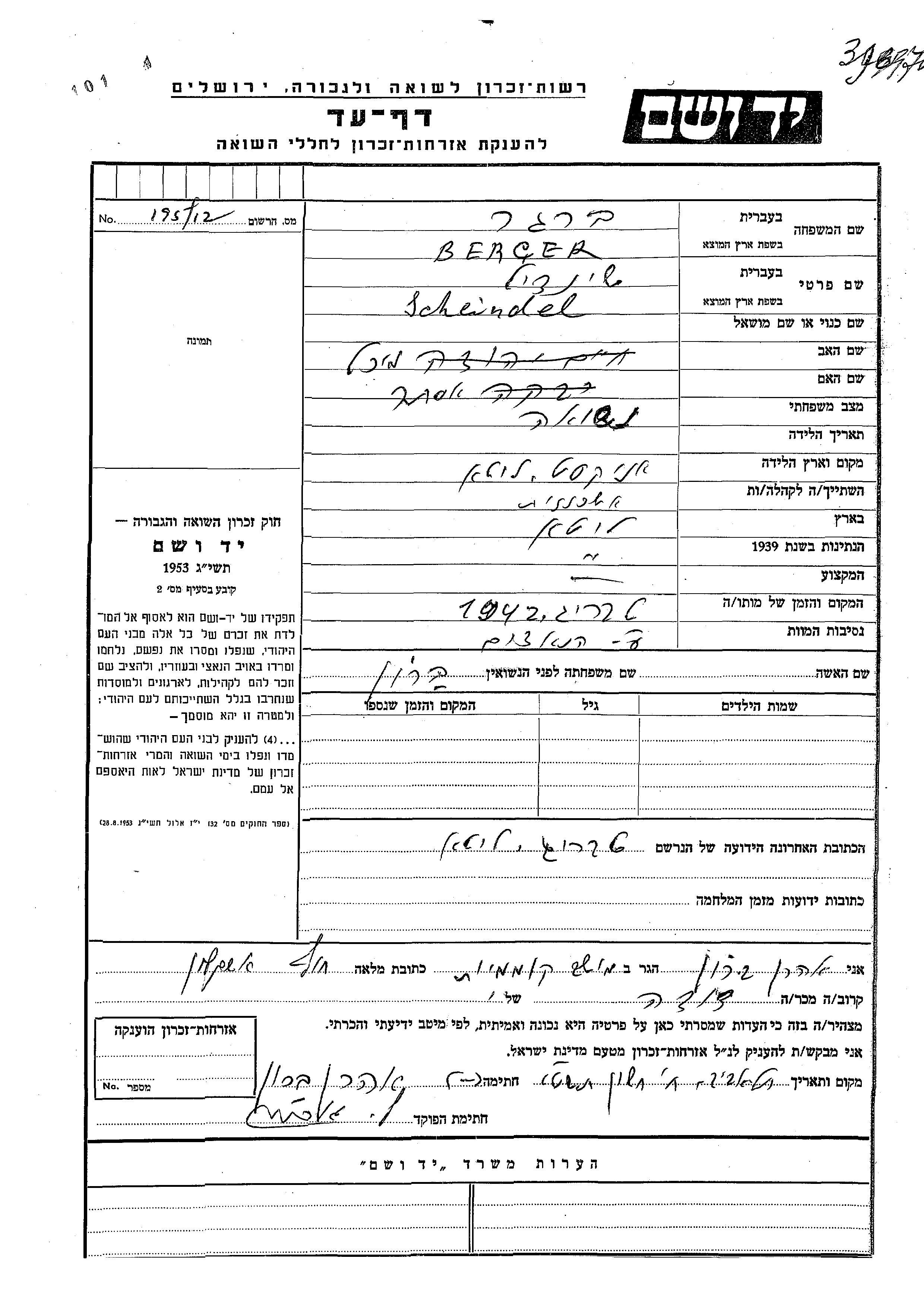 Scheindel Berger, geb. Brun wurde in Anikscai, Litauen geboren. Sie war die Tochter von Mikhel und Ester. Sie war Verheiratet. Vor dem Zweiten Weltkrieg lebte sie in Anikscai, Litauen. Während des Krieges war sie in Tavrig, Litauen.