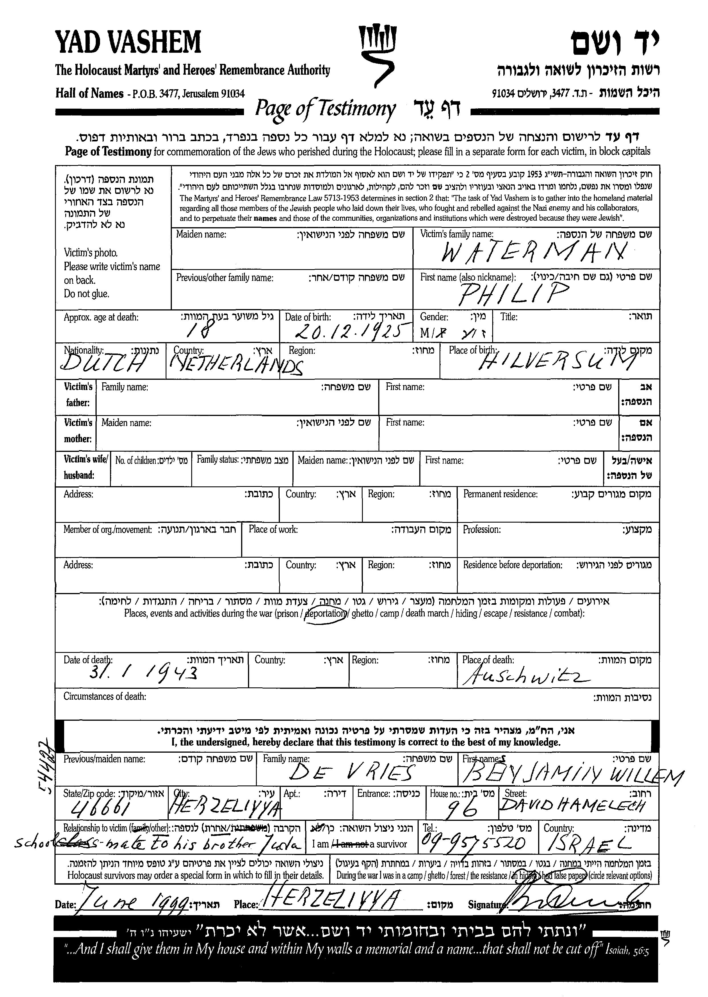 Philip wurde in der Schoah ermordet. Todesort: Auschwitz, Polen im Jahr 31/01/1943.