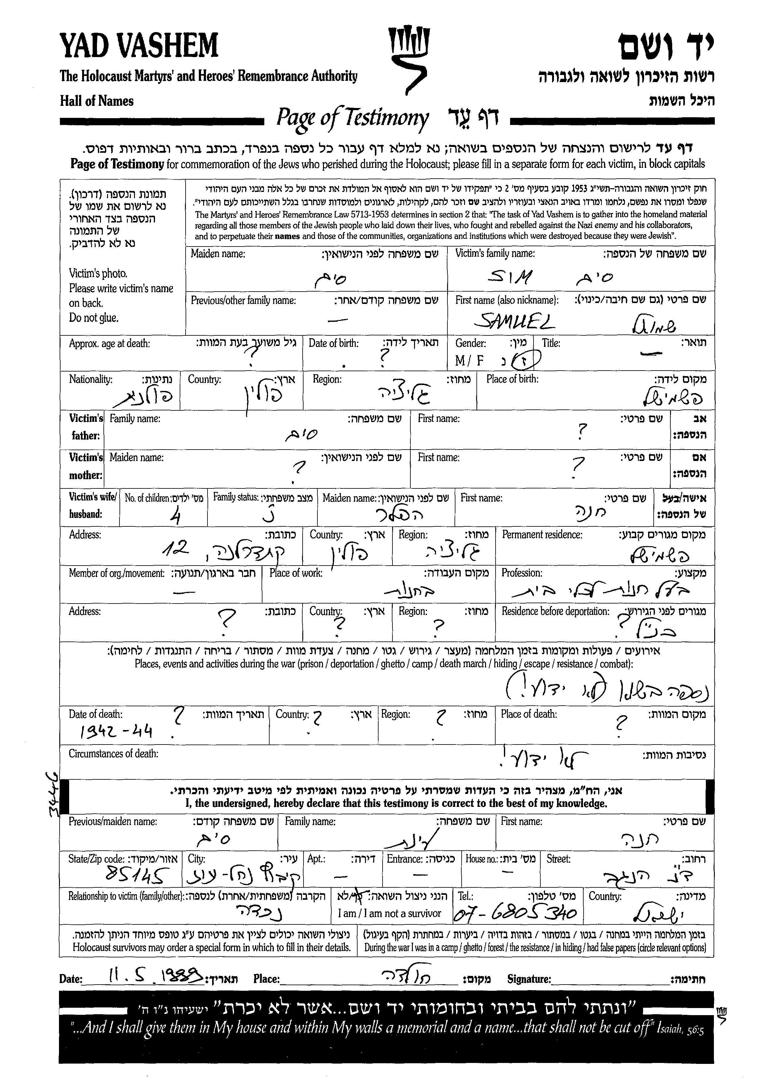 Shmuel Sim wurde in Przemysl, Polen geboren. Er war Inhaber eines haushaltswarengeschäfts und mit Khana, geb. Hafler Verheiratet. Vor dem Zweiten Weltkrieg lebte er in Przemysl, Polen. Während des Krieges war er in Przemysl, Polen.