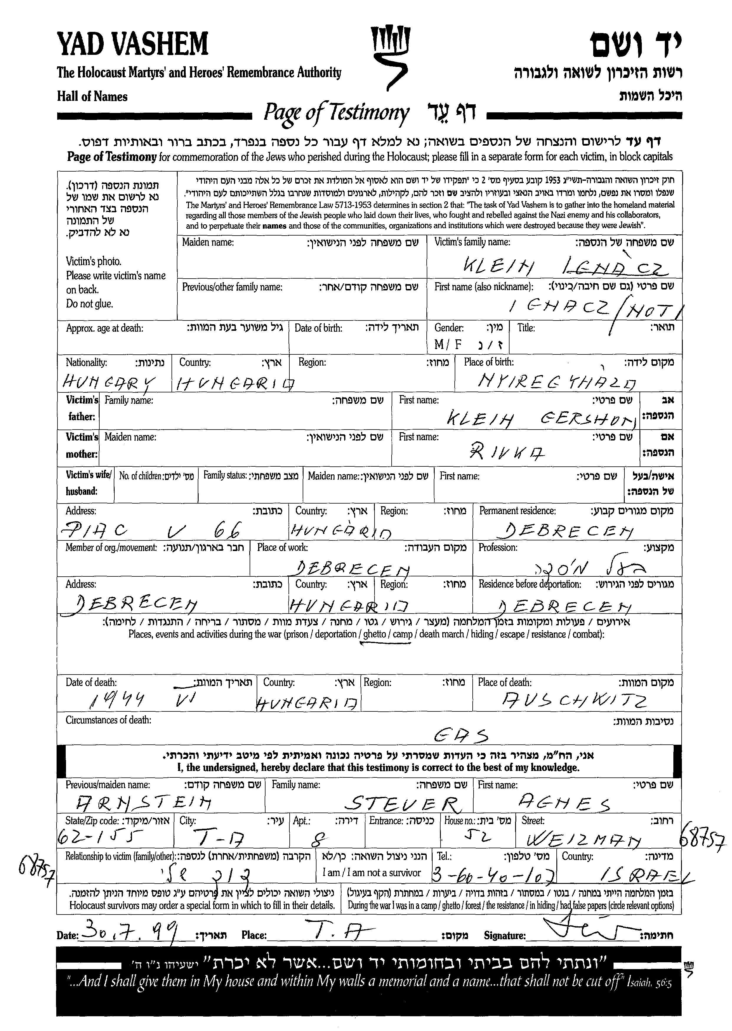 Ignacz Klein wurde in Nyiregyhaza, Ungarn geboren. Er war der Sohn von Gershon und Rivka. Er war Restaurantbesitzer/-in. Vor dem Zweiten Weltkrieg lebte er in Debrecen, Ungarn. Während des Krieges war er in Debrecen, Ungarn.