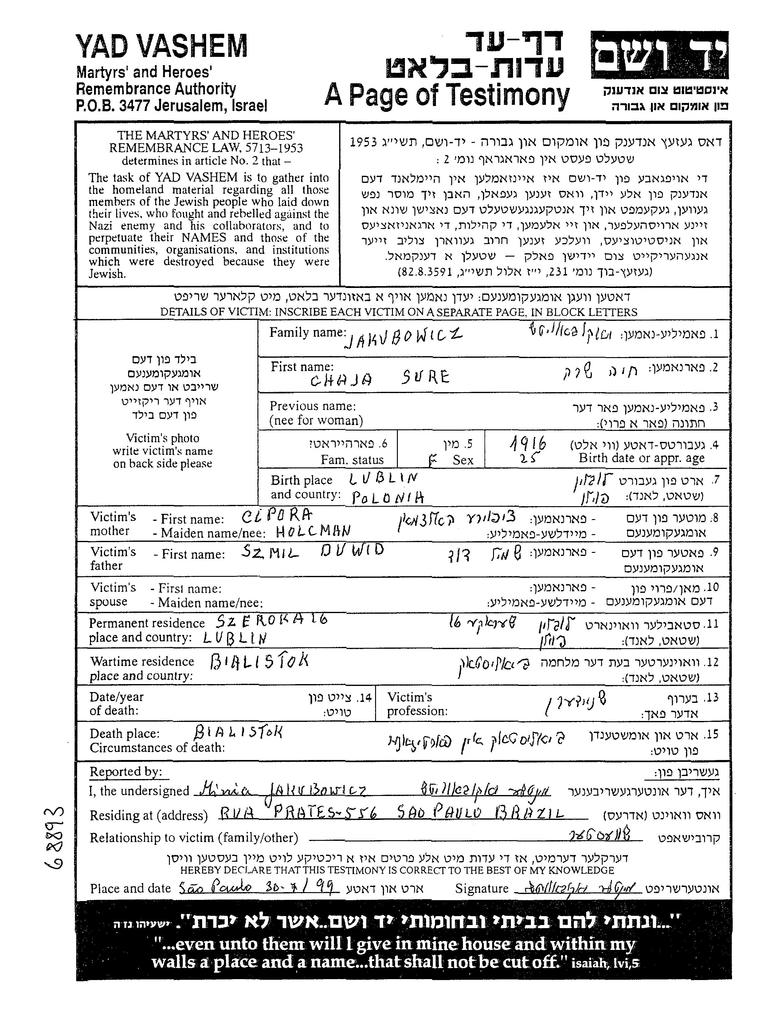 Jakubowicz Chaja Sure 1916 Lublin, Polen Gedenkblatt