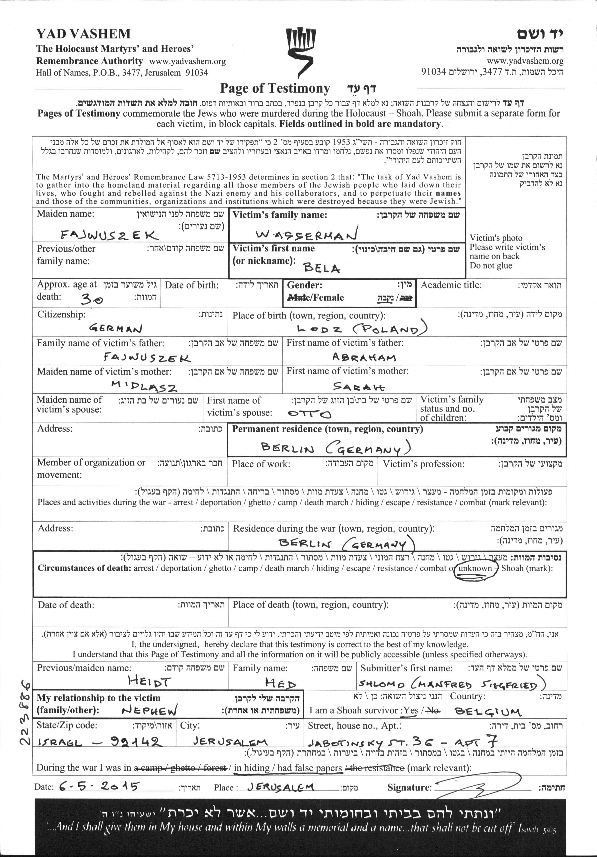 Bela Wasserman, geb. Fajwuszek wurde in Lodz, Polen geboren. Sie war die Tochter von Abraham und Sarah, geb. Midlasz. Sie war mit Otto Verheiratet. Vor dem Zweiten Weltkrieg lebte sie in Berlin, Deutsches Reich. Während des Krieges war sie in Berlin, Deutsches Reich.