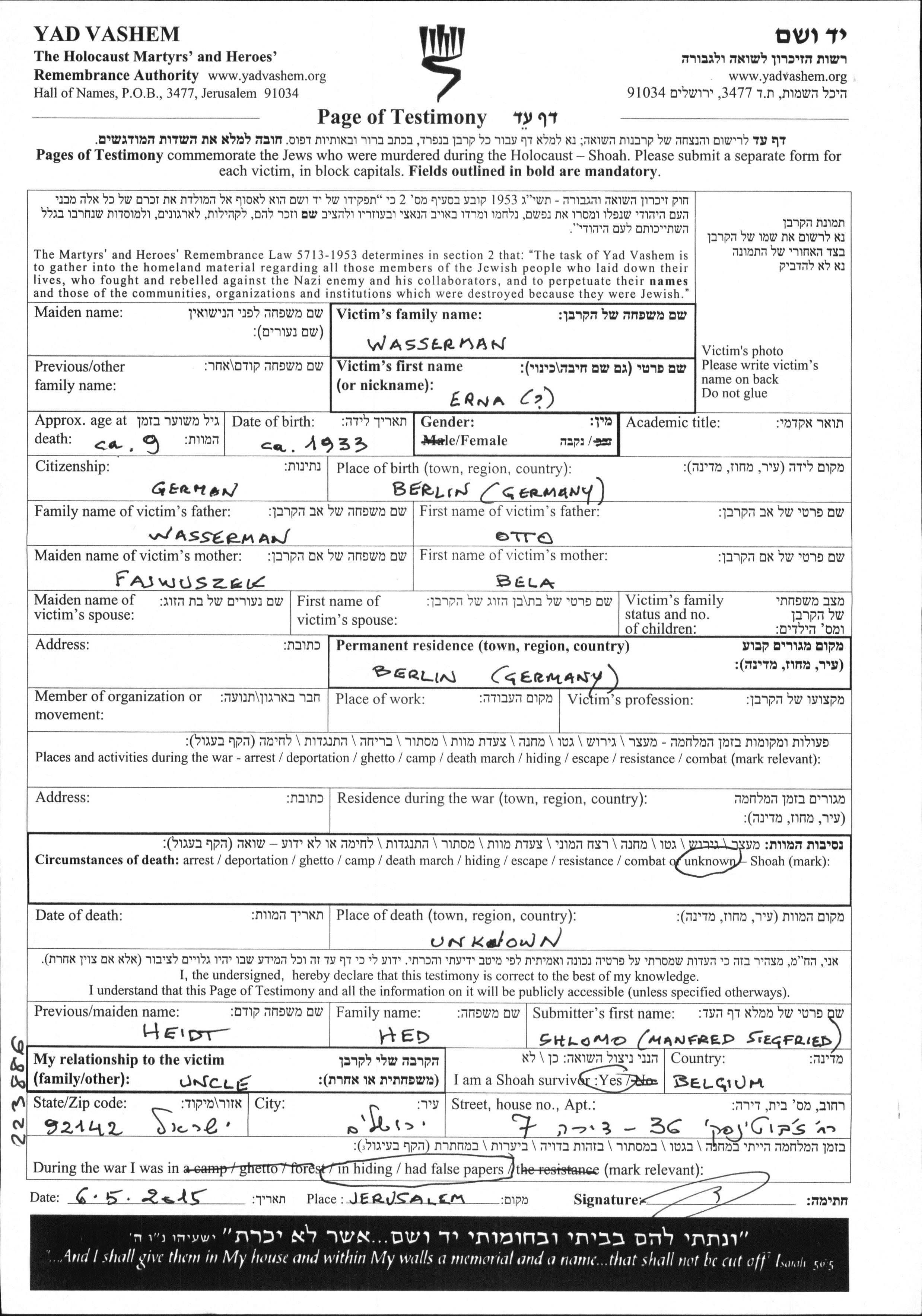 Erna Wasserman wurde in Berlin, Deutsches Reich geboren. Sie war die Tochter von Otto und Bela, geb. Fajwuszek. Sie war Kind. Vor dem Zweiten Weltkrieg lebte sie in Berlin, Deutsches Reich.