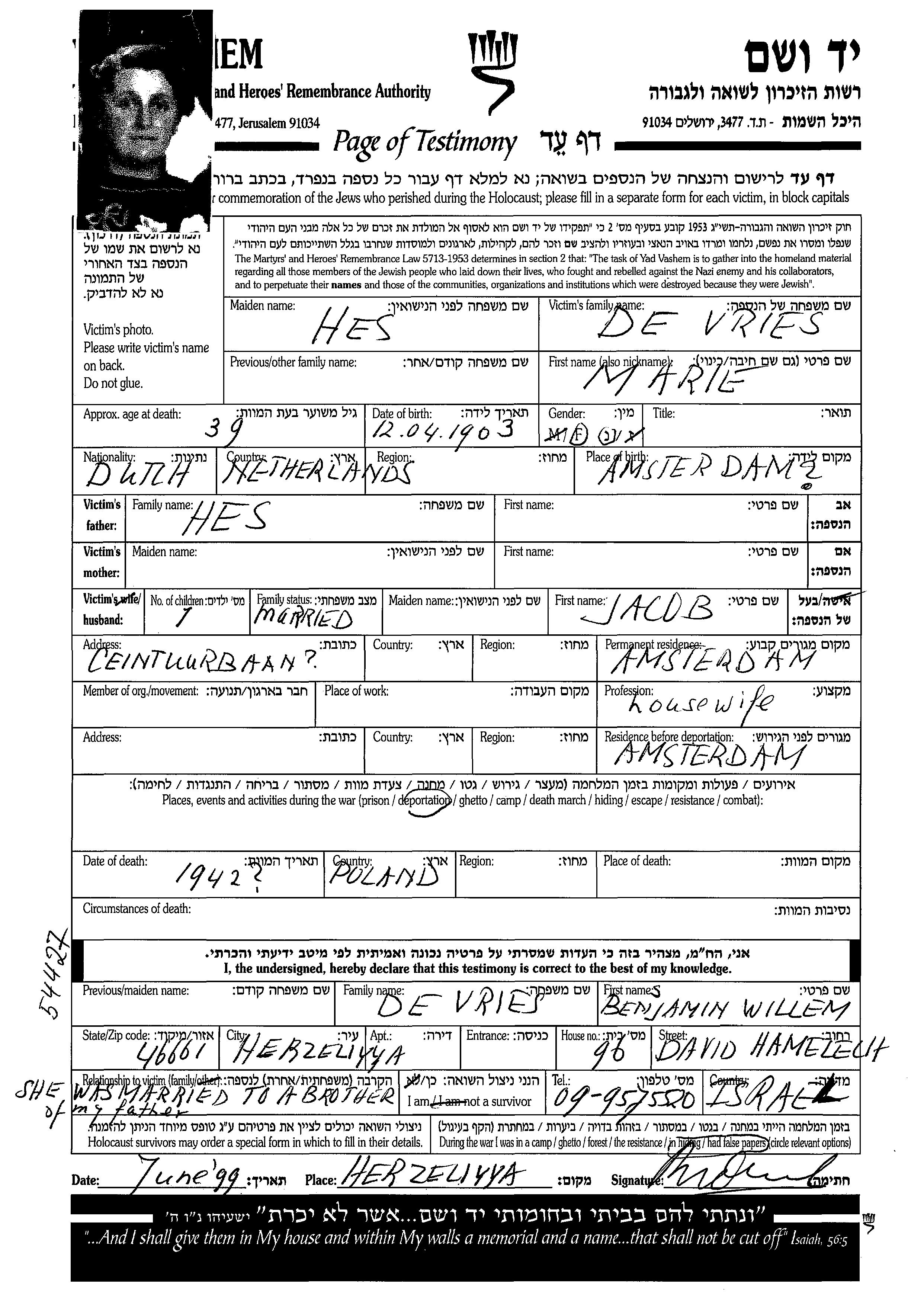 Marie Vries de, geb. Hes wurde im Jahr 1903 in Amsterdam, Niederlande geboren. Sie war Hausfrau und mit Jacob Verheiratet. Vor dem Zweiten Weltkrieg lebte sie in Amsterdam, Niederlande. Während des Krieges war sie in Amsterdam, Niederlande.