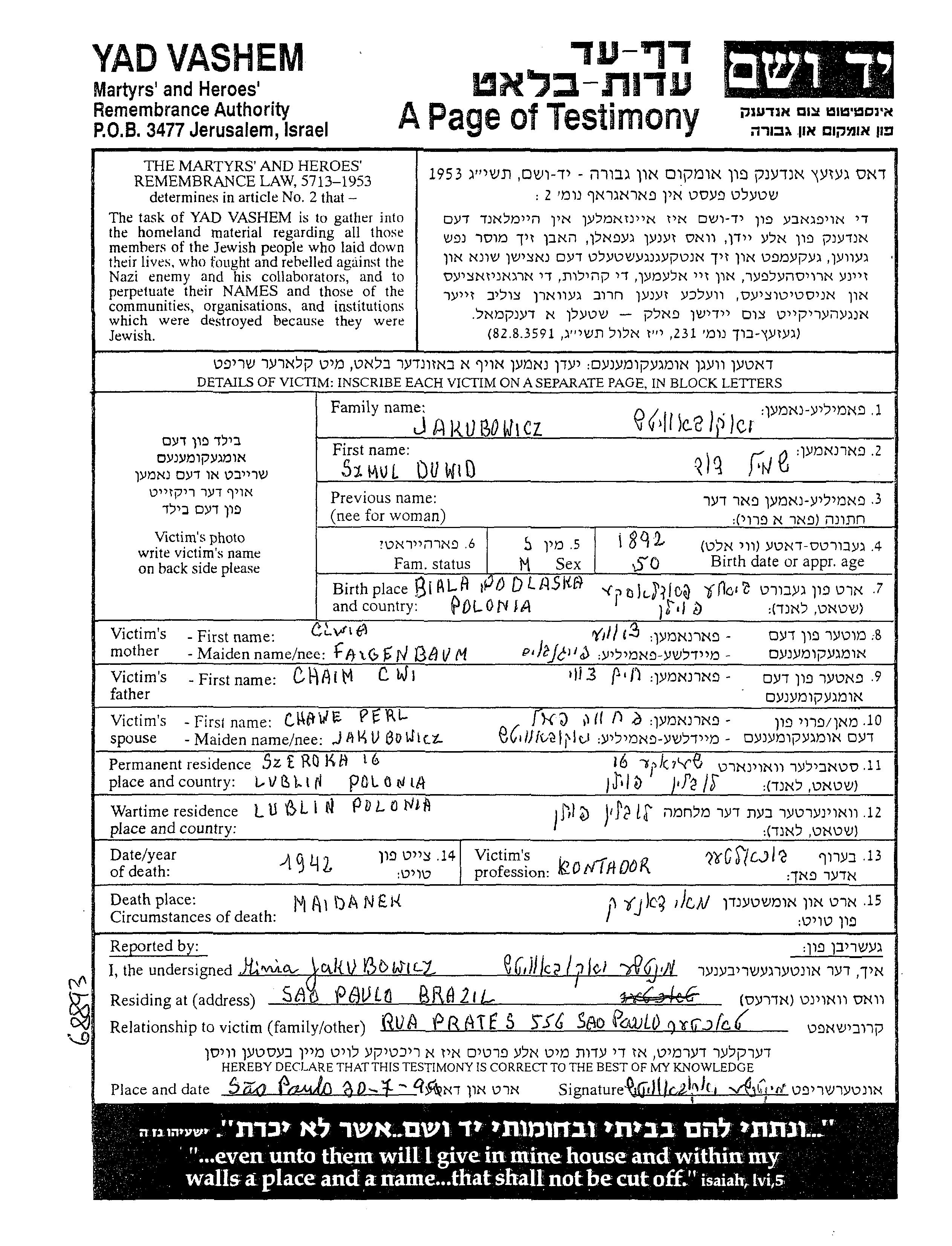 Szmul Duwid Jakubowicz wurde im Jahr 1892 in Biala Podlaska, Polen geboren. Er war der Sohn von Chaim Cwi und Ciwia. Er war Contador und mit Chawe Perl Verheiratet. Vor dem Zweiten Weltkrieg lebte er in Lublin, Polen. Während des Krieges war er in Lublin, Polen.