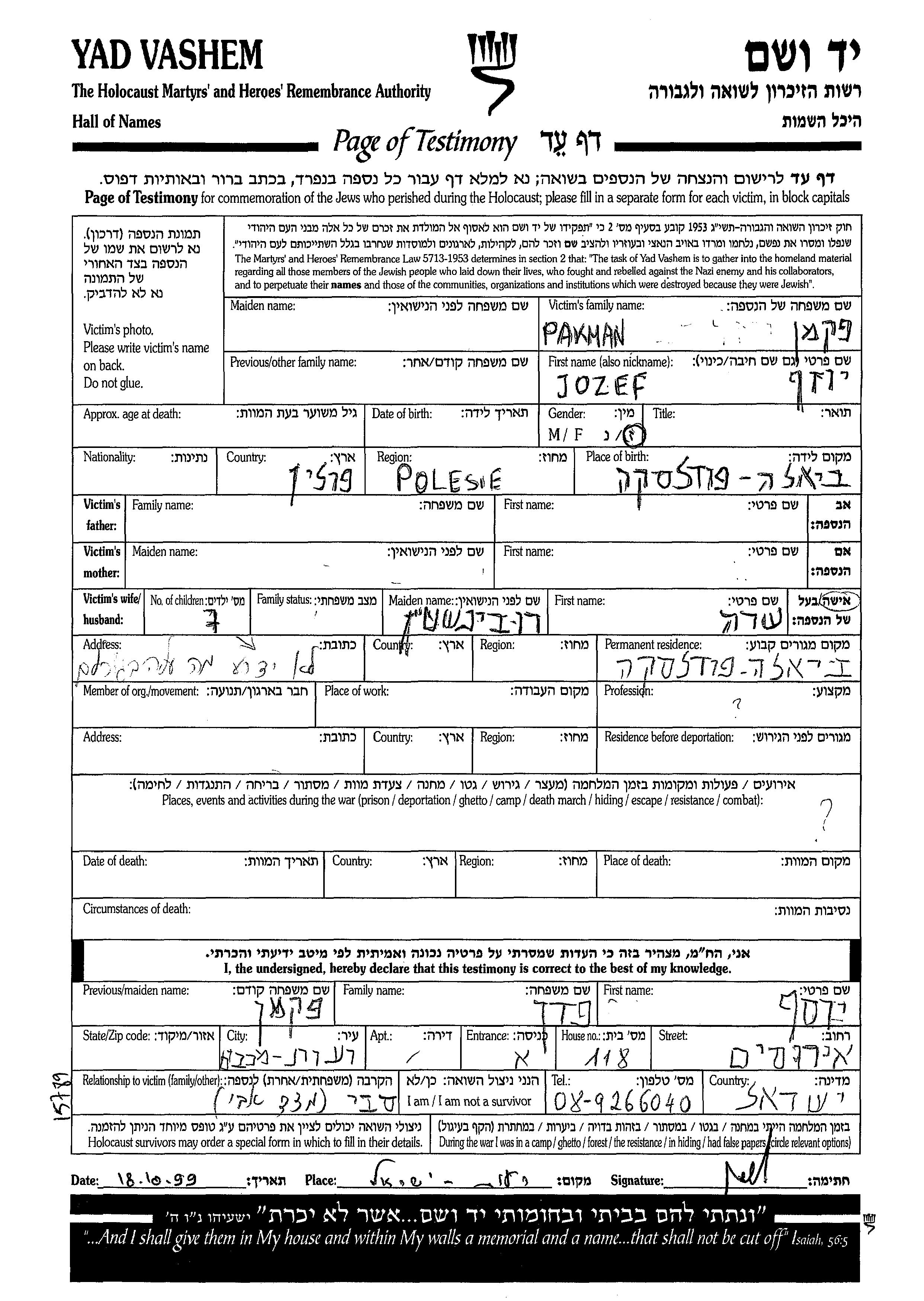 Jozef Pakman wurde in Biala Podlaska, Polen geboren. Vor dem Zweiten Weltkrieg lebte er in Biala Podlaska, Polen.
