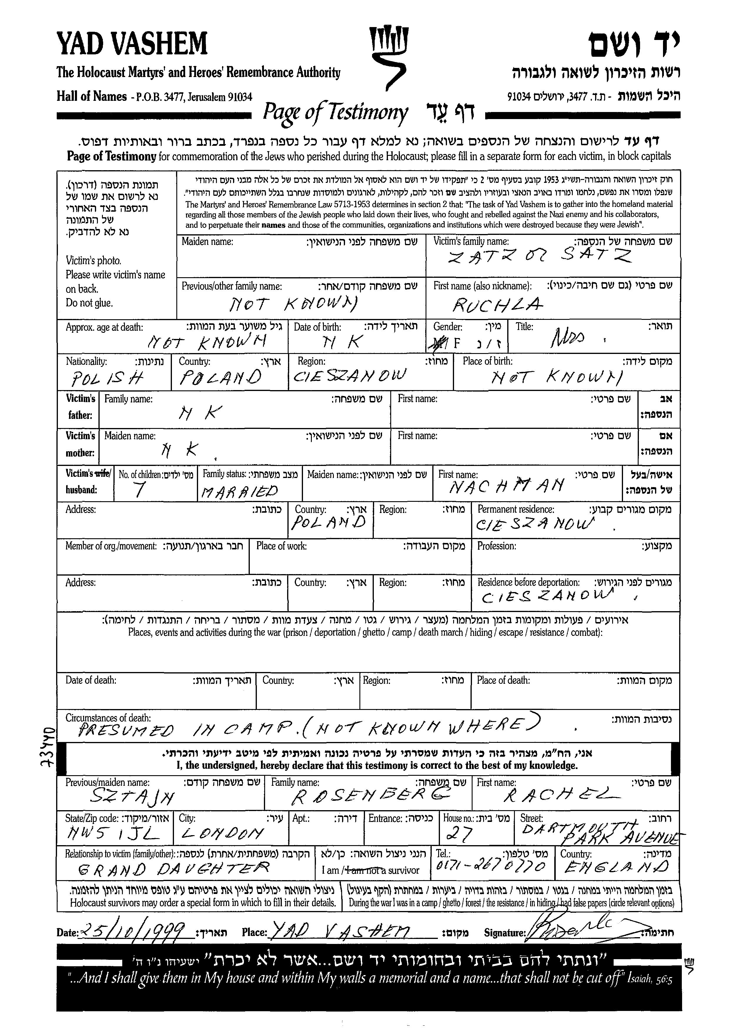 Ruchla Zatz wurde in Cieszanow, Polen geboren. Sie war mit Nachman Verheiratet. Vor dem Zweiten Weltkrieg lebte sie in Cieszanow, Polen. Während des Krieges war sie in Cieszanow, Polen.