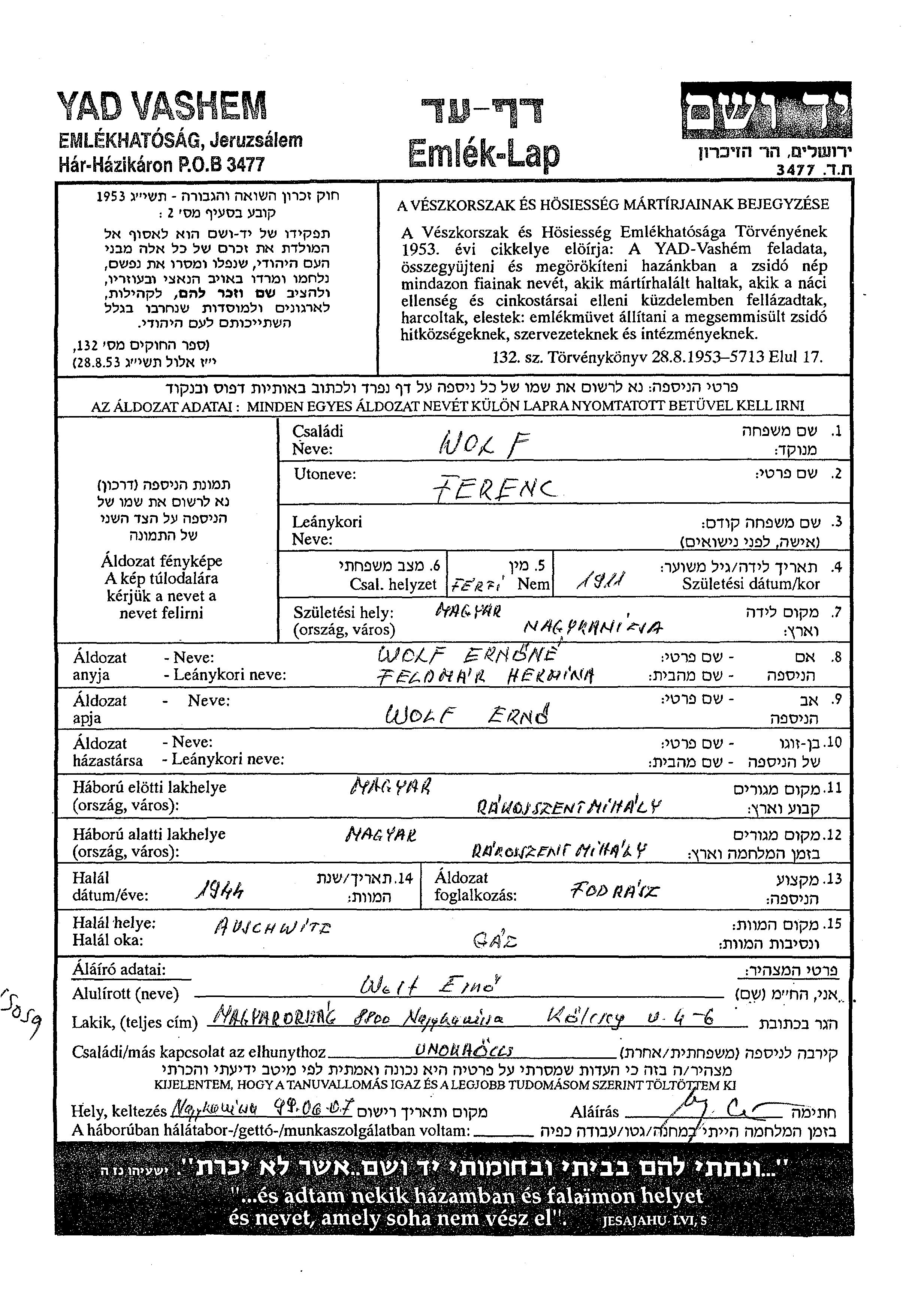 Ferentz Wolf wurde im Jahr 1911 in Nagykanizsa, Ungarn geboren. Er war der Sohn von Erno und Hermina. Er war Friseur/-in. Vor dem Zweiten Weltkrieg lebte er in Rakosszentmihaly, Ungarn. Während des Krieges war er in Rakosszentmihaly, Ungarn.