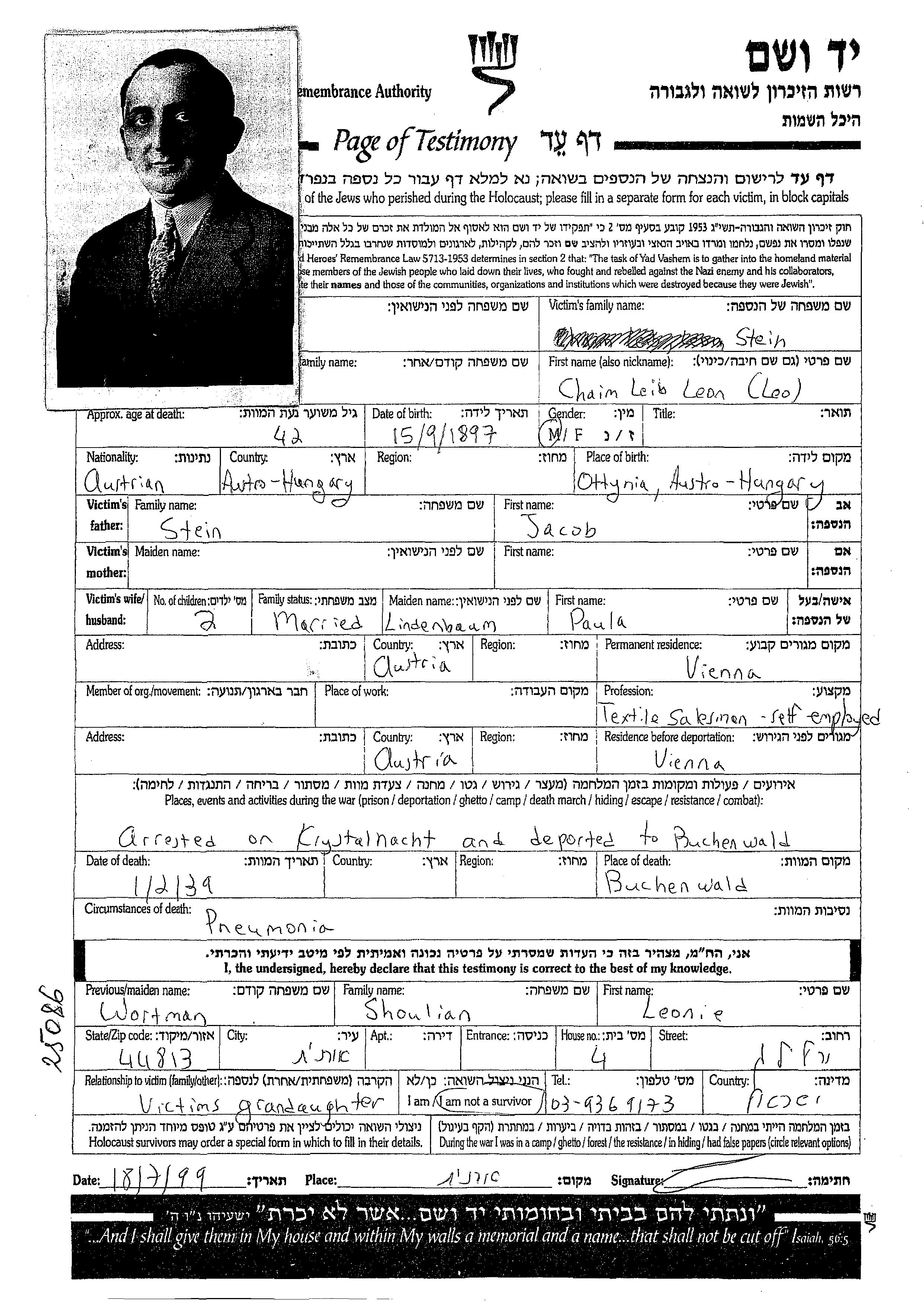 Chaim Leib Leon Stein wurde im Jahr 1897 in Ottynia, Polen geboren. Er war der Sohn von Jacob. Er war Textile und mit Paula, geb. Lindenbaum Verheiratet. Vor dem Zweiten Weltkrieg lebte er in Wien, Österreich. Während des Krieges war er in Wien, Österreich.