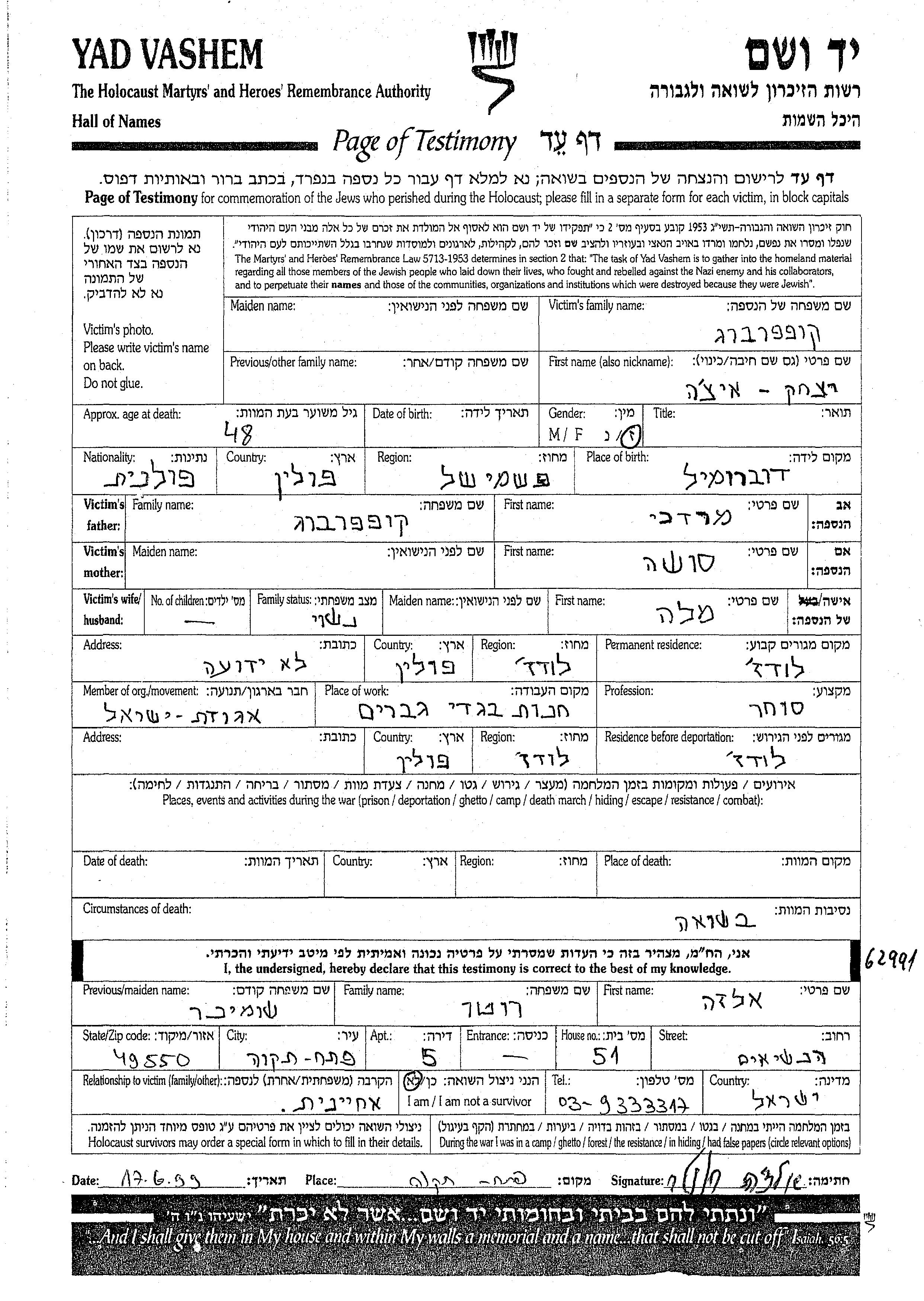 Kuperberg Yitzkhak Lodz, Polen Gedenkblatt