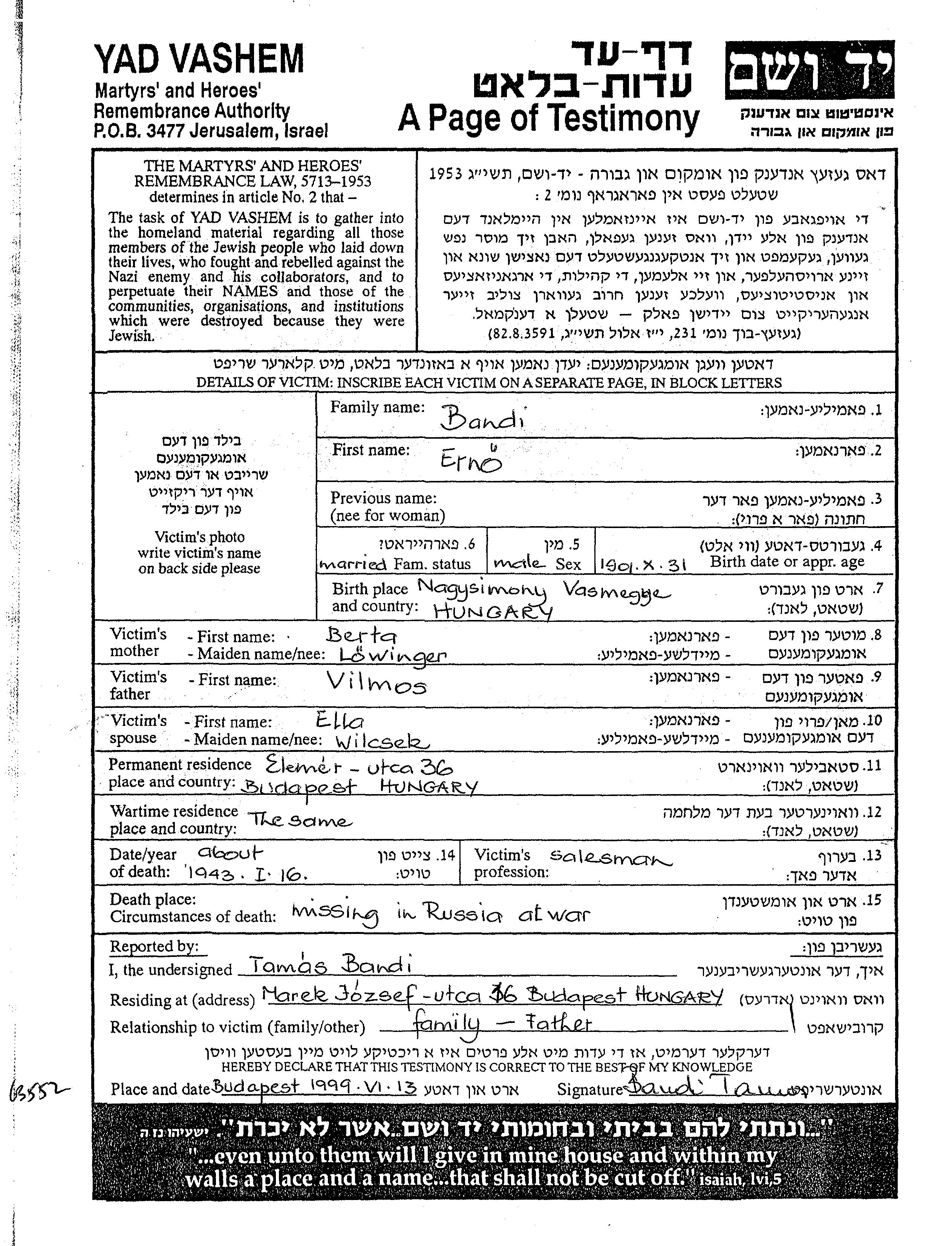 Erno Bandi wurde im Jahr 1901 in Nagysimonyi, Ungarn geboren. Er war der Sohn von Vilmosh und Berta. Er war Handelsvertreter/in und mit Ella, geb. Wilcsek Verheiratet. Vor dem Zweiten Weltkrieg lebte er in Budapest, Ungarn. Während des Krieges war er in Budapest, Ungarn.