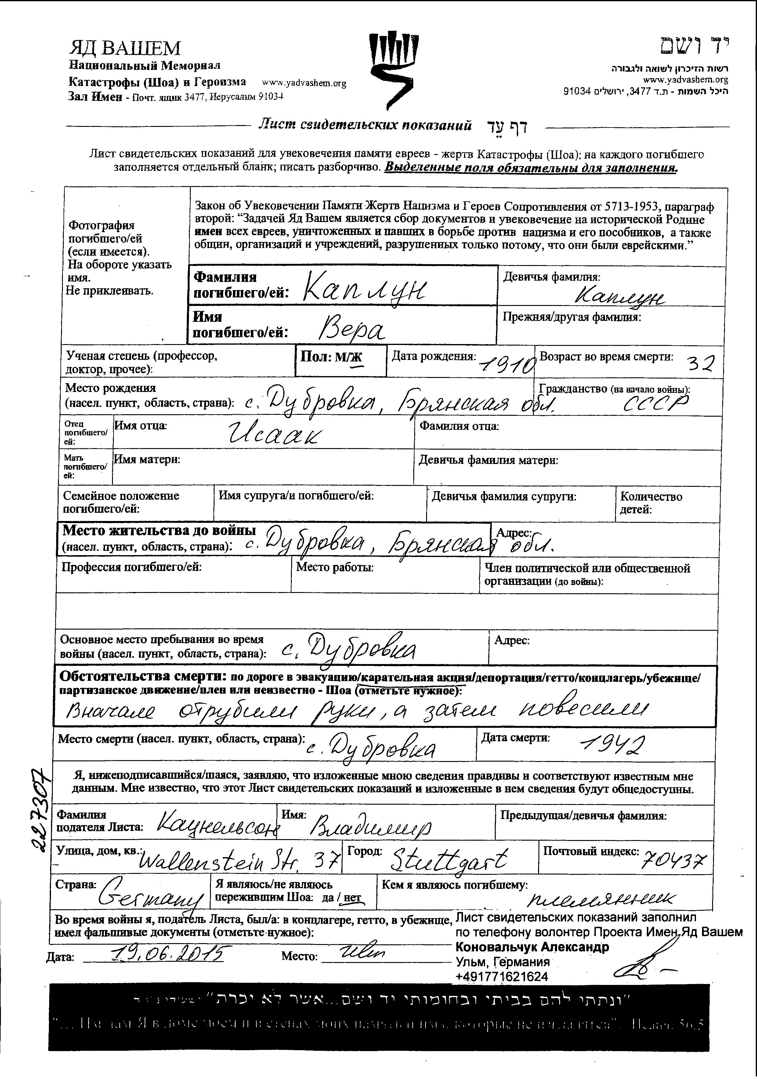 Vera wurde in der Schoah ermordet. Todesort: Dubrovka, Russland (UdSSR) im Jahr 1942.
