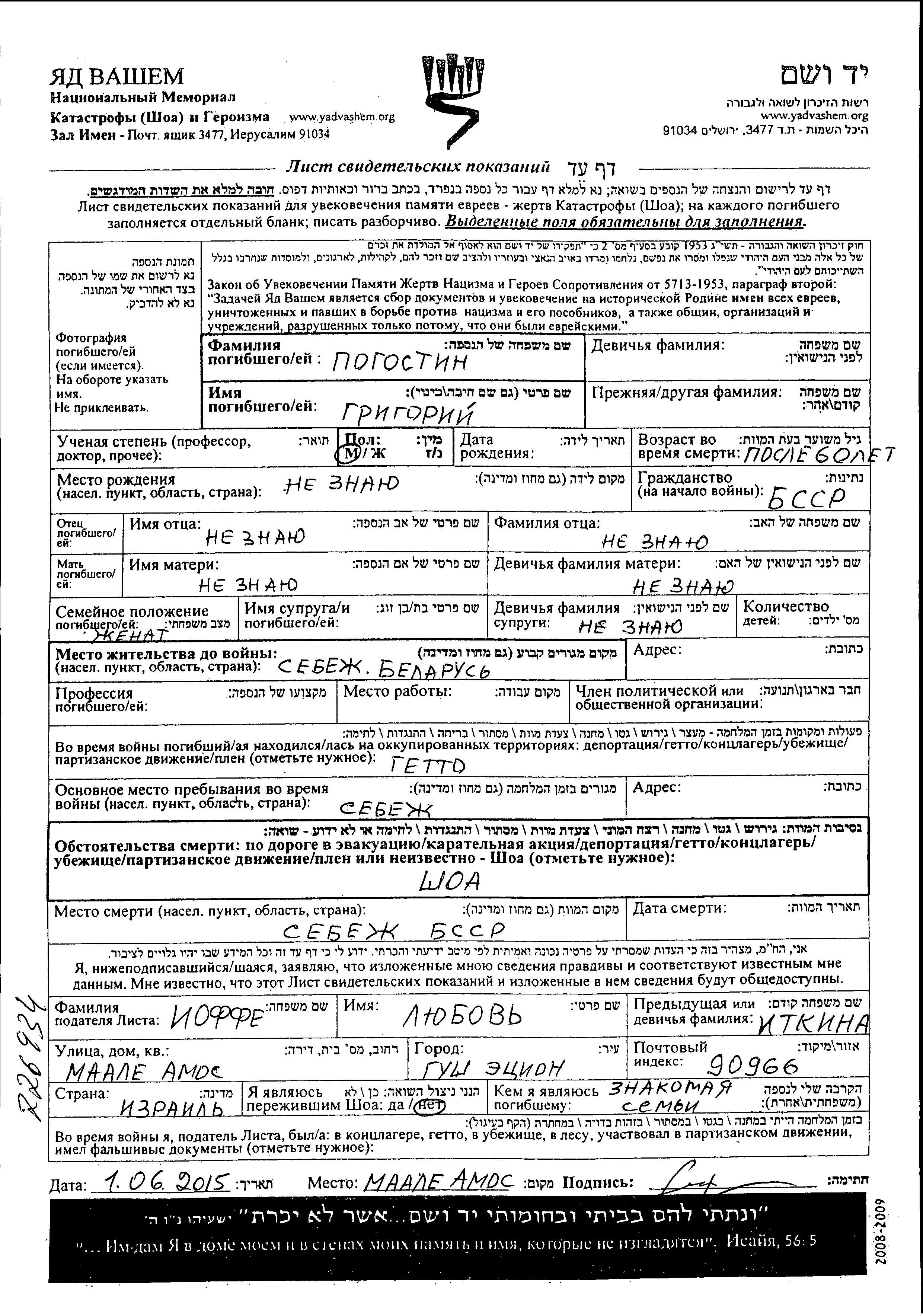 Grigoriy wurde in der Schoah ermordet. Todesort: Sebezh, Russland (UdSSR).