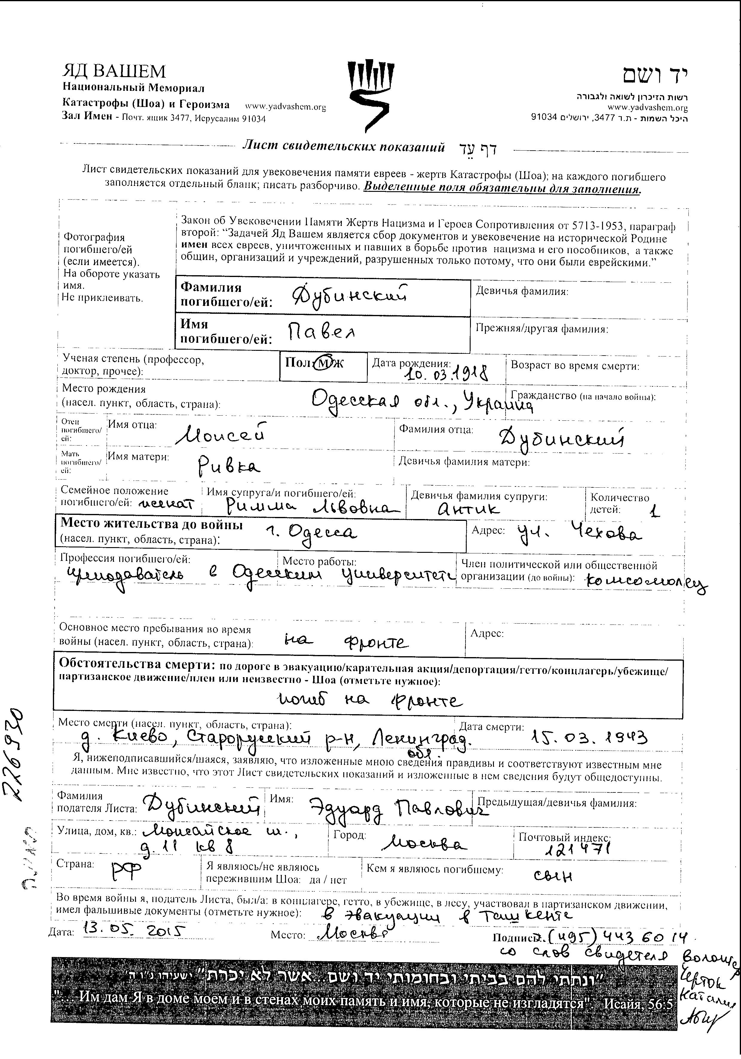Dubinski | Pavel | 1918 | Odessa, Ukraine (UdSSR) | Gedenkblatt |