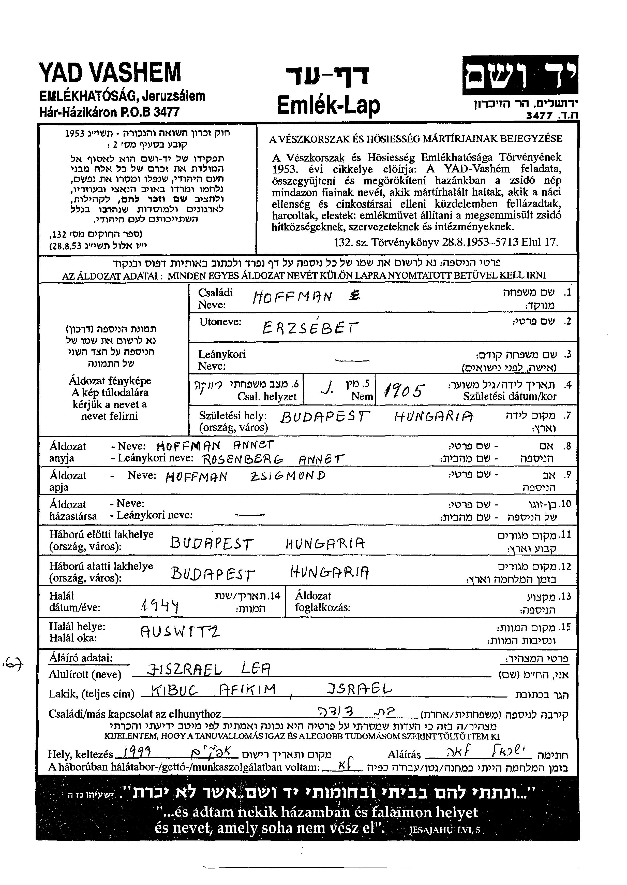 Erzsebet Hoffman wurde im Jahr 1905 in Budapest, Ungarn geboren. Sie war die Tochter von Zsigmond und Annet. Sie war Ledig. Vor dem Zweiten Weltkrieg lebte sie in Budapest, Ungarn. Während des Krieges war sie in Budapest, Ungarn.