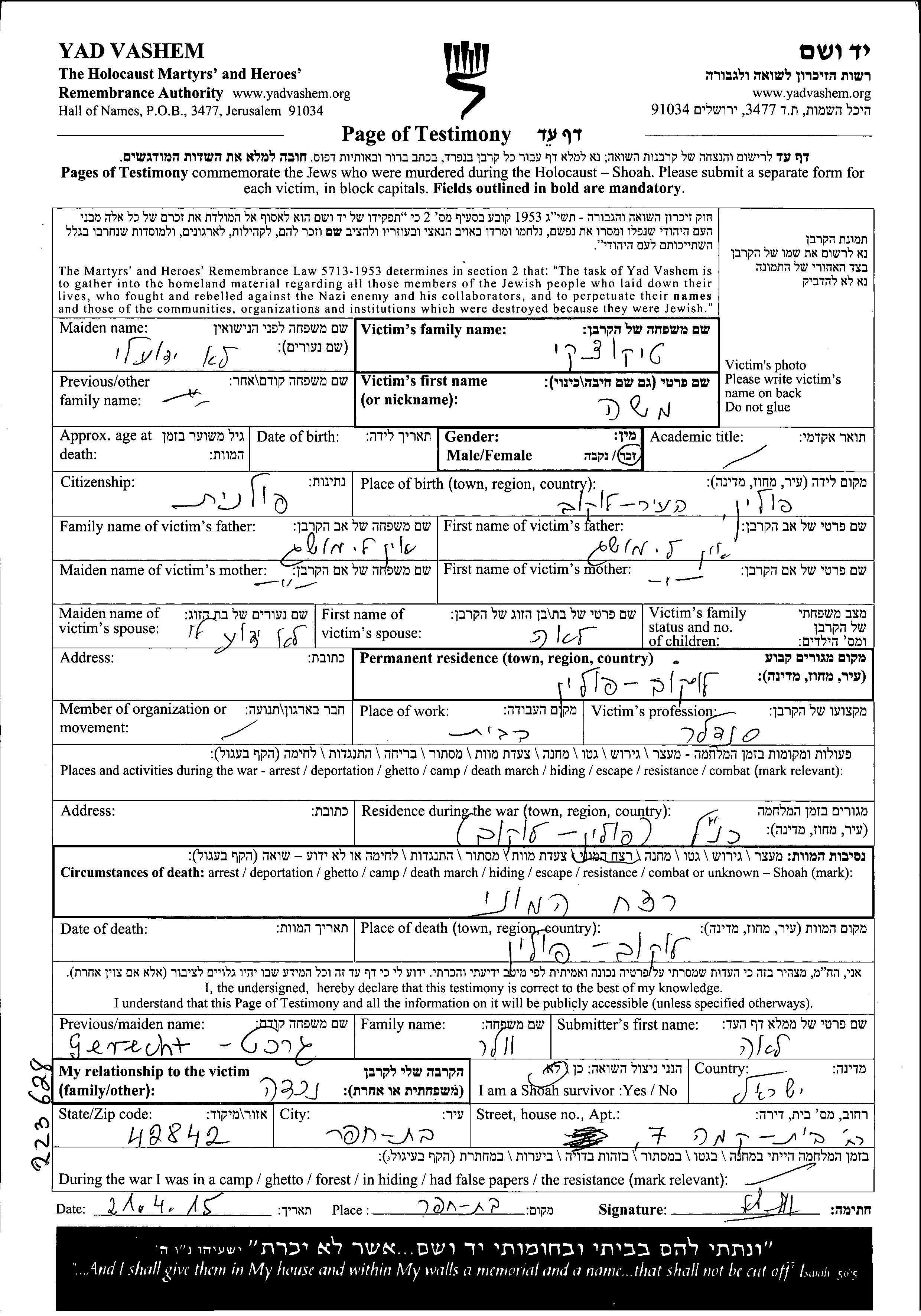 Moshe wurde in der Schoah ermordet. Todesort: Lukow, Polen.