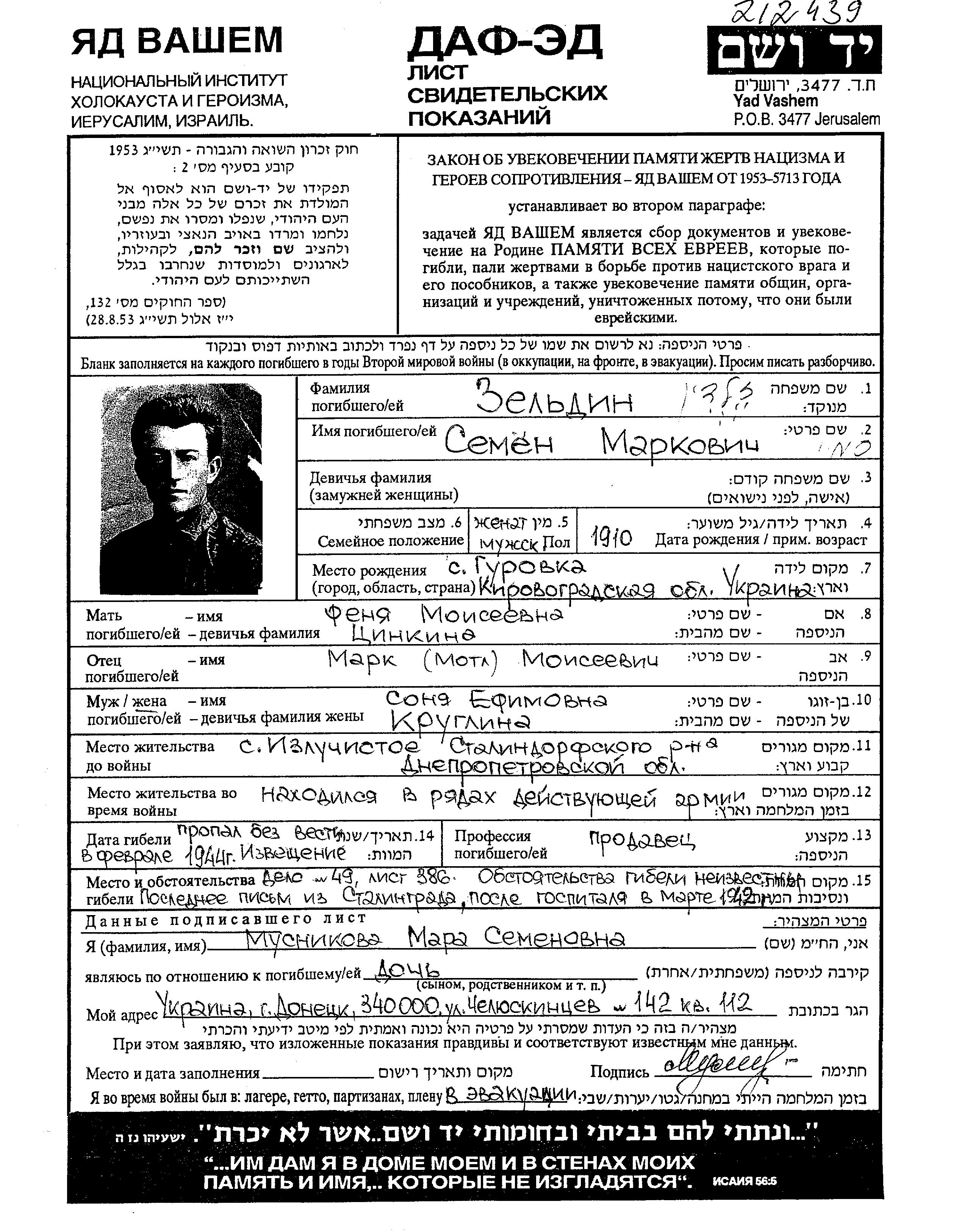 Zeldin Semion 1910 Izluchistoye, Ukraine (UdSSR) Gedenkblatt