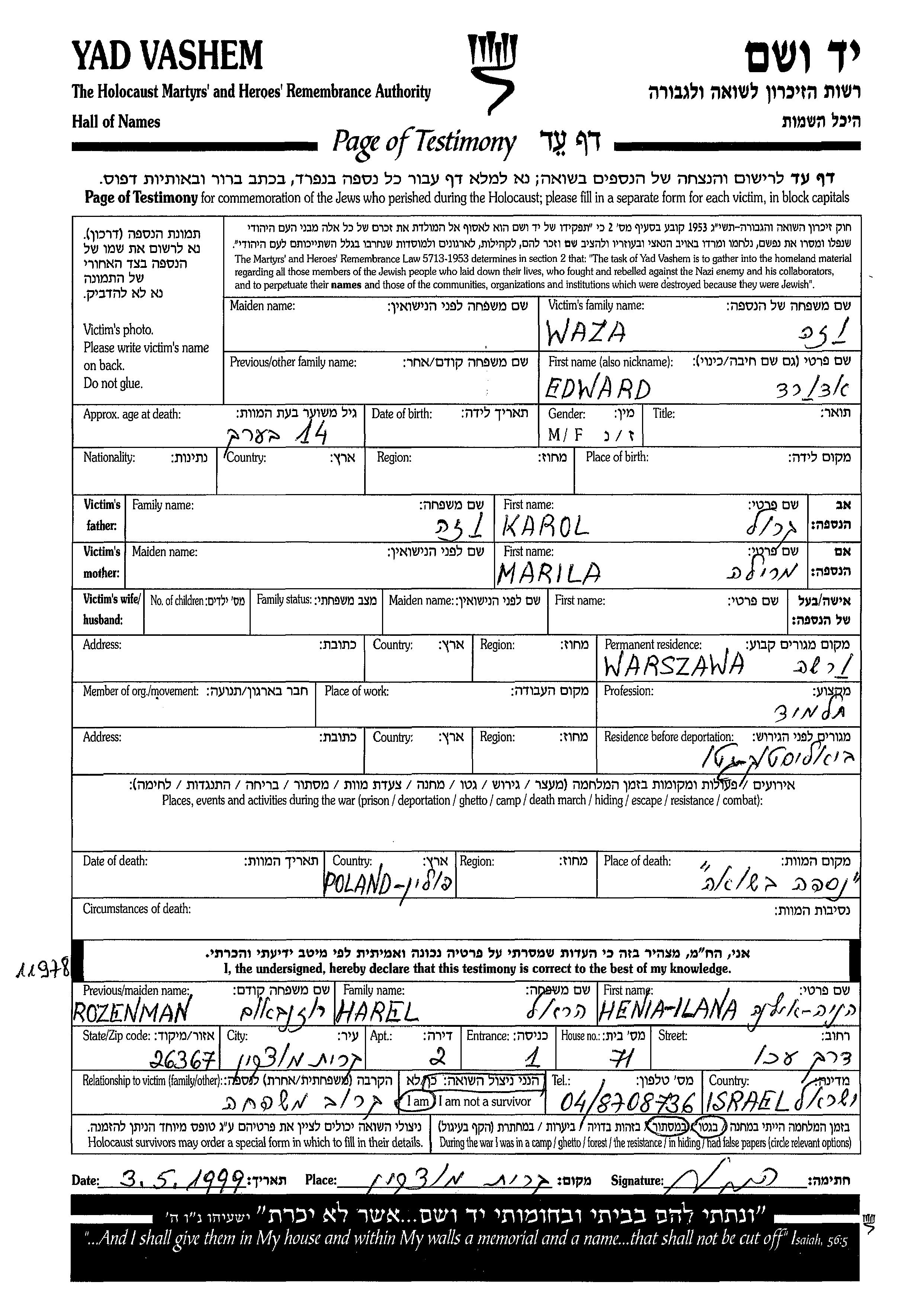 Edward Waza wurde Er war der Sohn von Karol und Marila. Er war Schüler/-in. Vor dem Zweiten Weltkrieg lebte er in Warszawa, Polen. Während des Krieges war er in Bialystok, Polen.