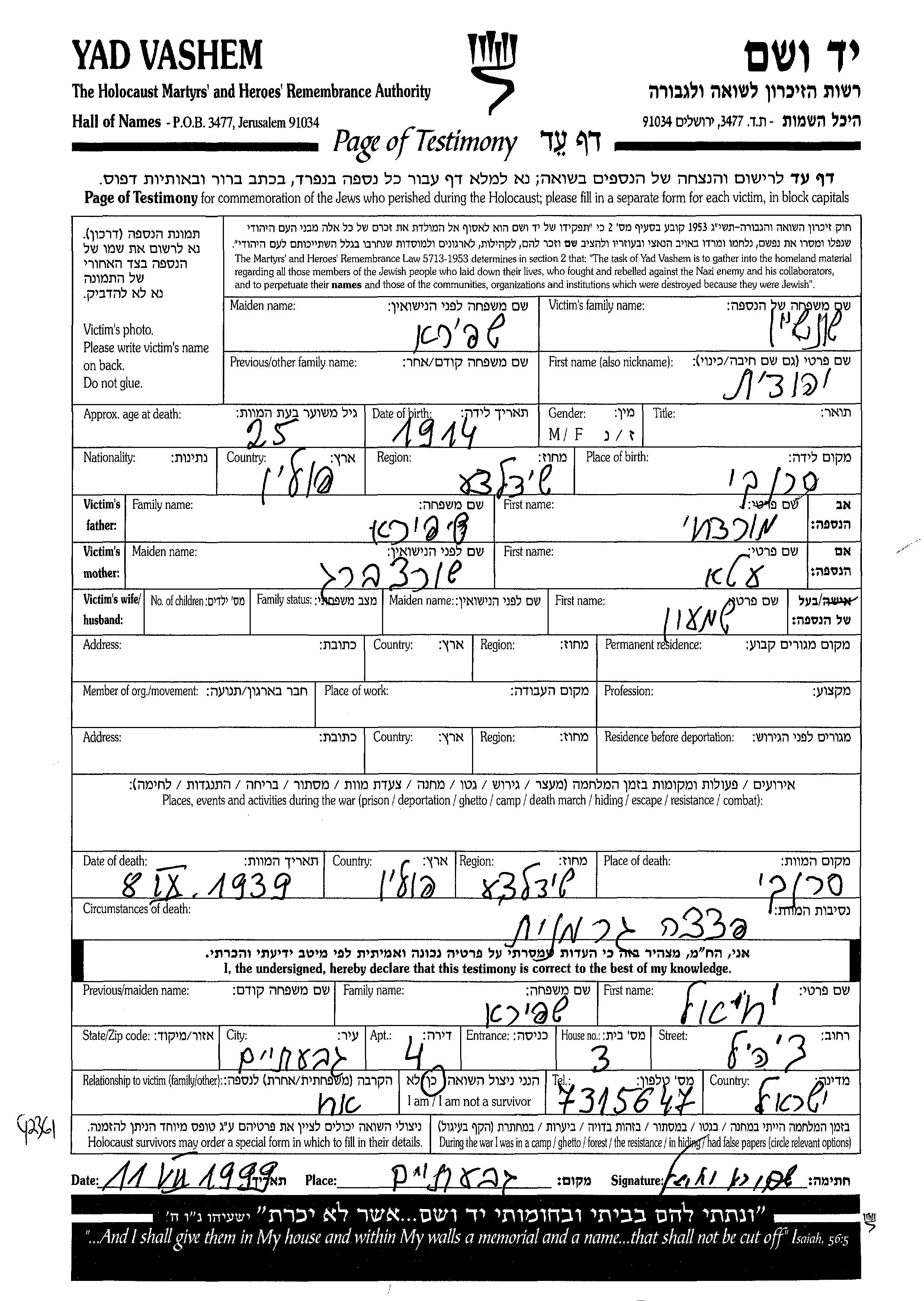 Yehudit wurde in der Schoah ermordet. Todesort: Sarnaki, Polen im Jahr 08/09/1939.