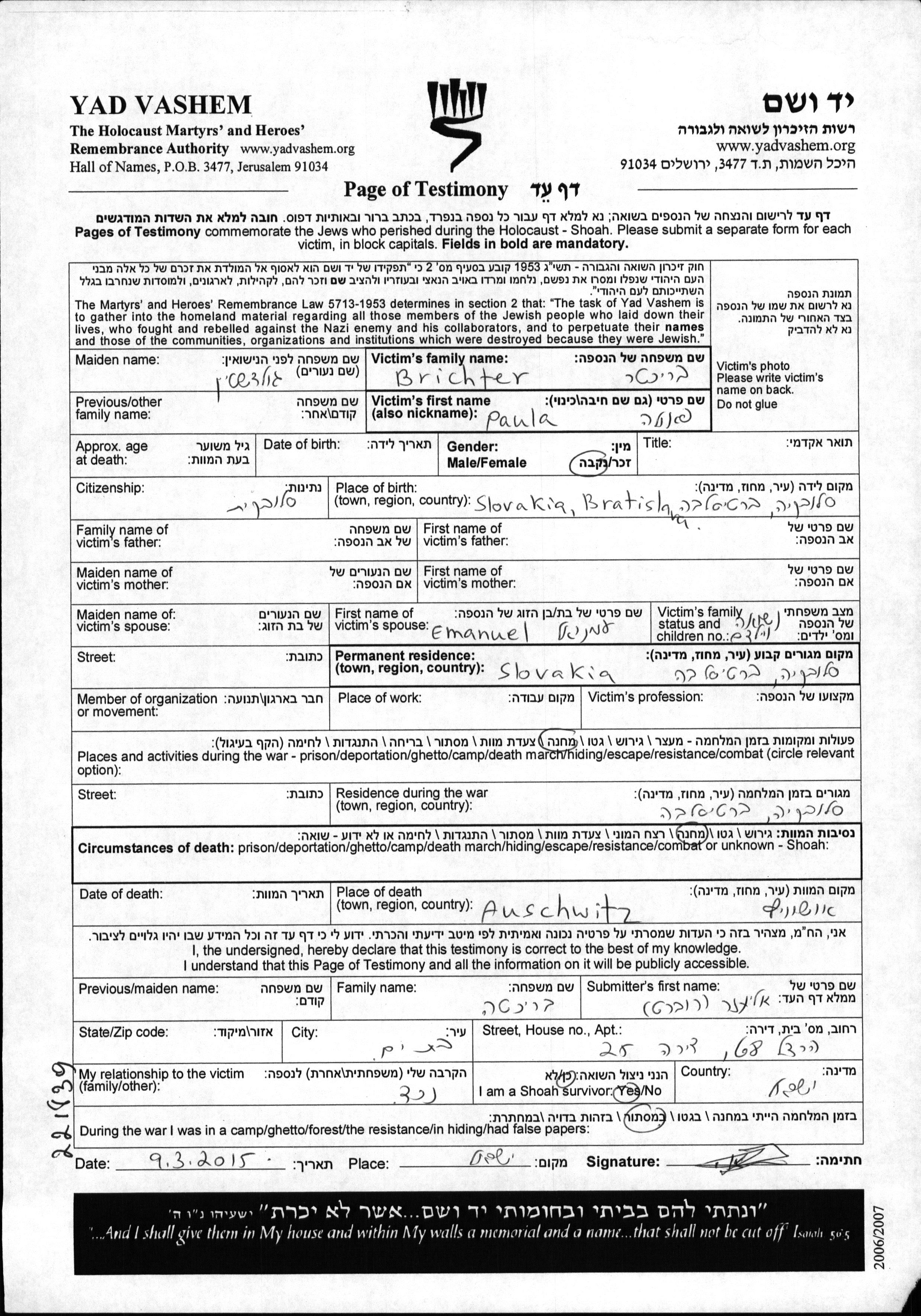 Paula Brichter, geb. Goldshtein wurde in Bratislava, Tschechoslowakei geboren. Sie war mit Emanuel Verheiratet. Vor dem Zweiten Weltkrieg lebte sie in Bratislava, Tschechoslowakei. Während des Krieges war sie in Auschwitz, Polen.