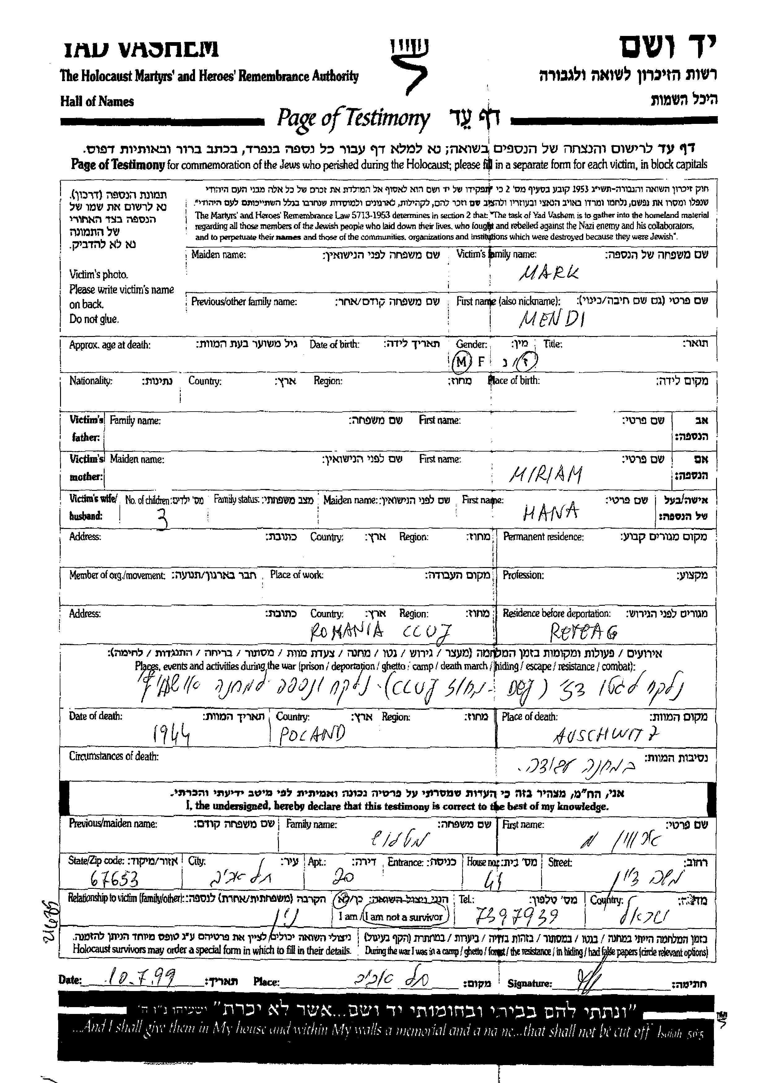 Mendi Mark wurde Er war der Sohn von Miriam. Während des Krieges war er in Des, Rumänien.
