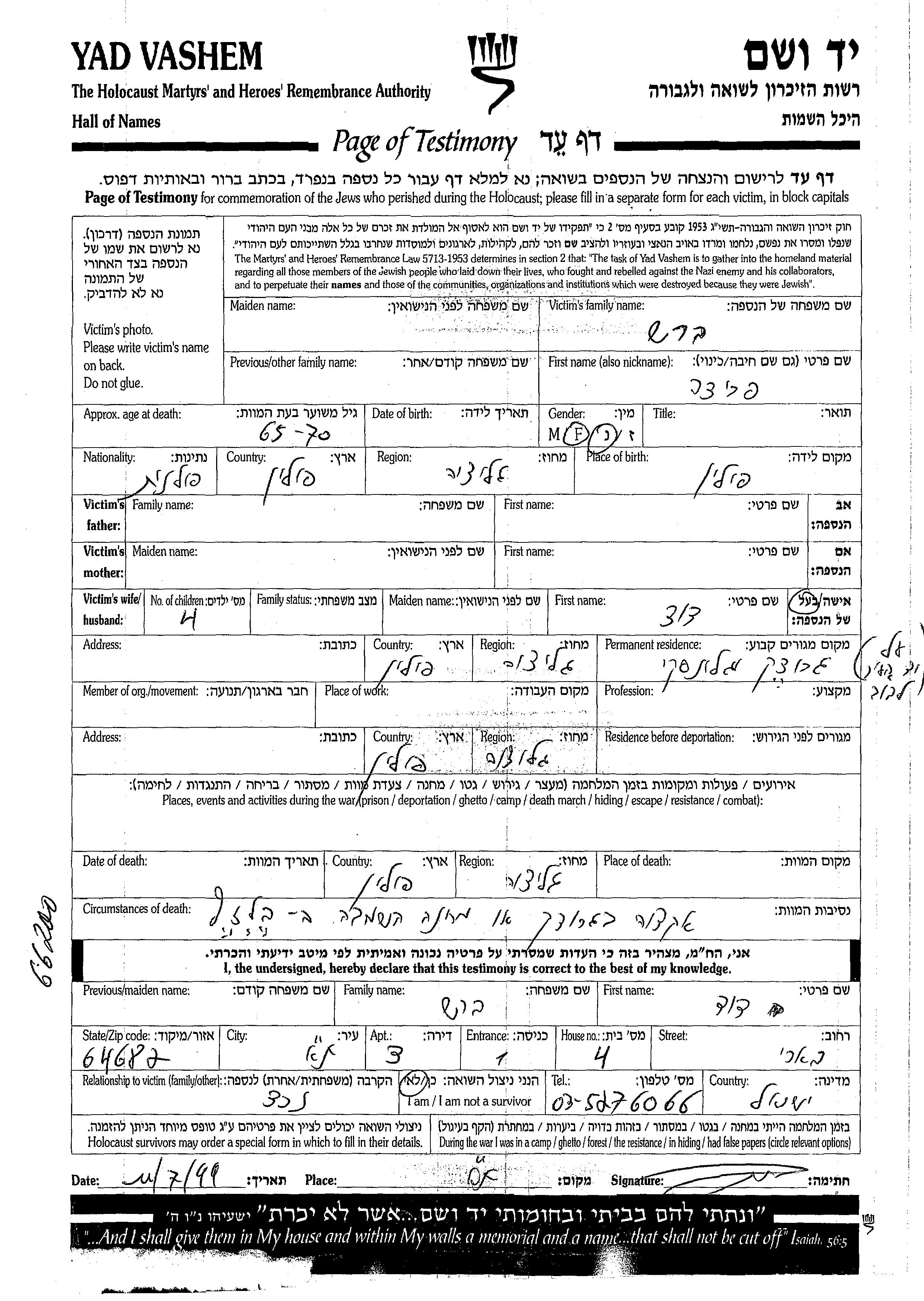 Frida wurde in der Schoah ermordet. Todesort: Galizien Region, Polen.