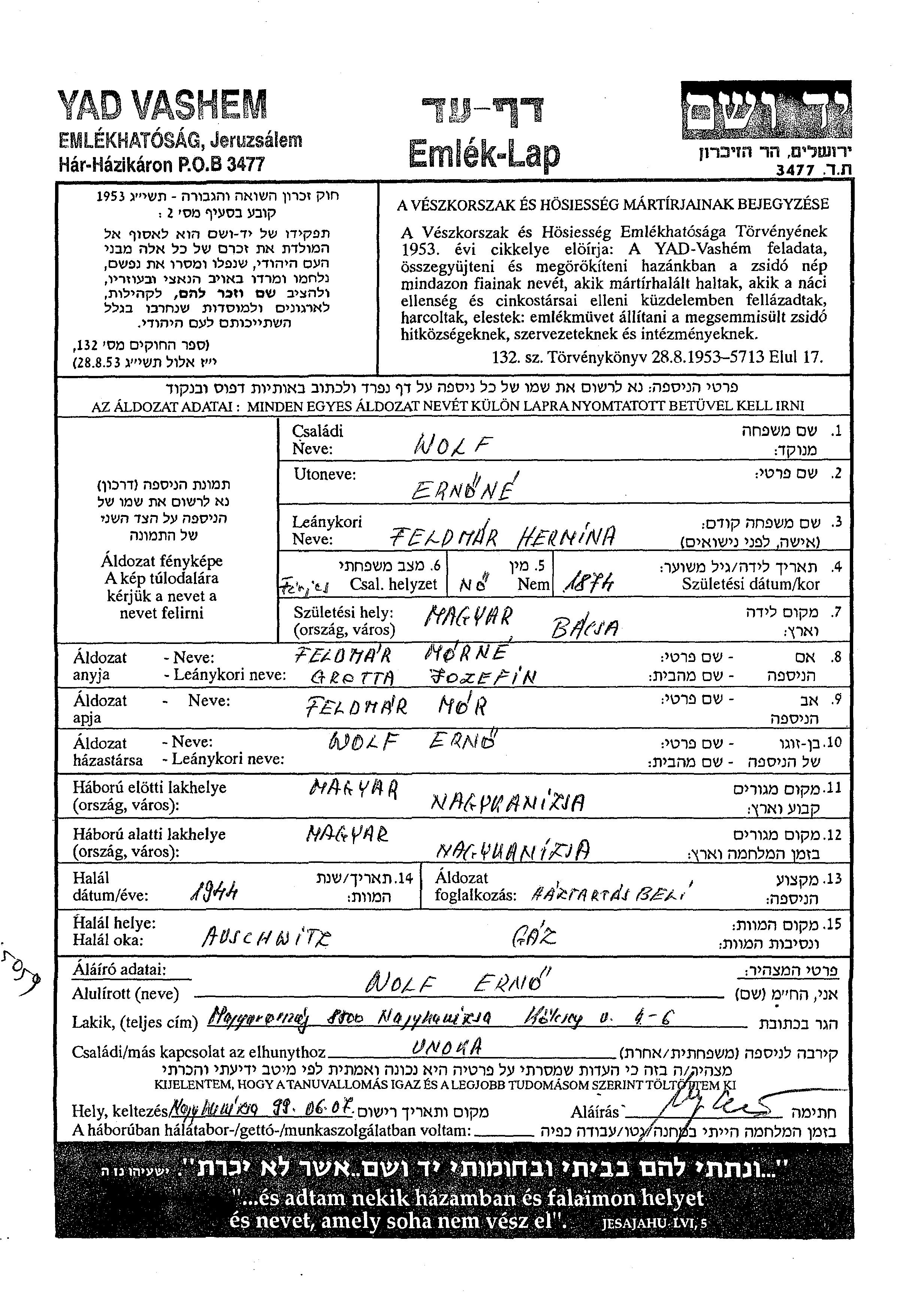 Hermina Wolf, geb. Feldmar wurde im Jahr 1874 in Bacsa, Ungarn geboren. Sie war die Tochter von Mor und Jozefin. Sie war Hausfrau und mit Erno Verheiratet. Vor dem Zweiten Weltkrieg lebte sie in Nagykanizsa, Ungarn. Während des Krieges war sie in Nagykanizsa, Ungarn.