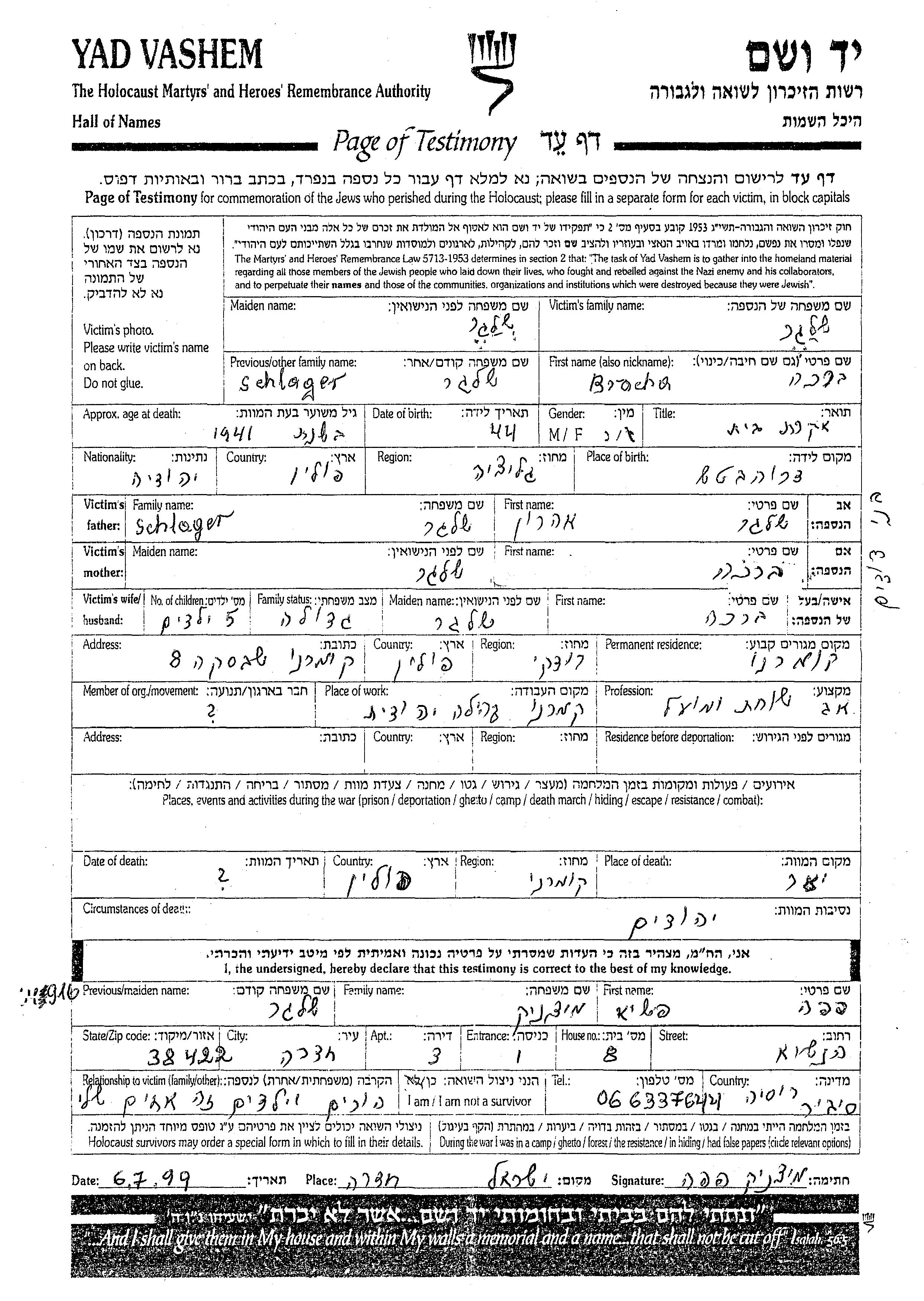 Bracha Shlager, geb. Shlager wurde im Jahr 1941 in Drohobycz, Polen geboren. Sie war die Tochter von Aharon und Brakha. Sie war Ehefrau eines schächters. Vor dem Zweiten Weltkrieg lebte sie in Komarno, Polen.