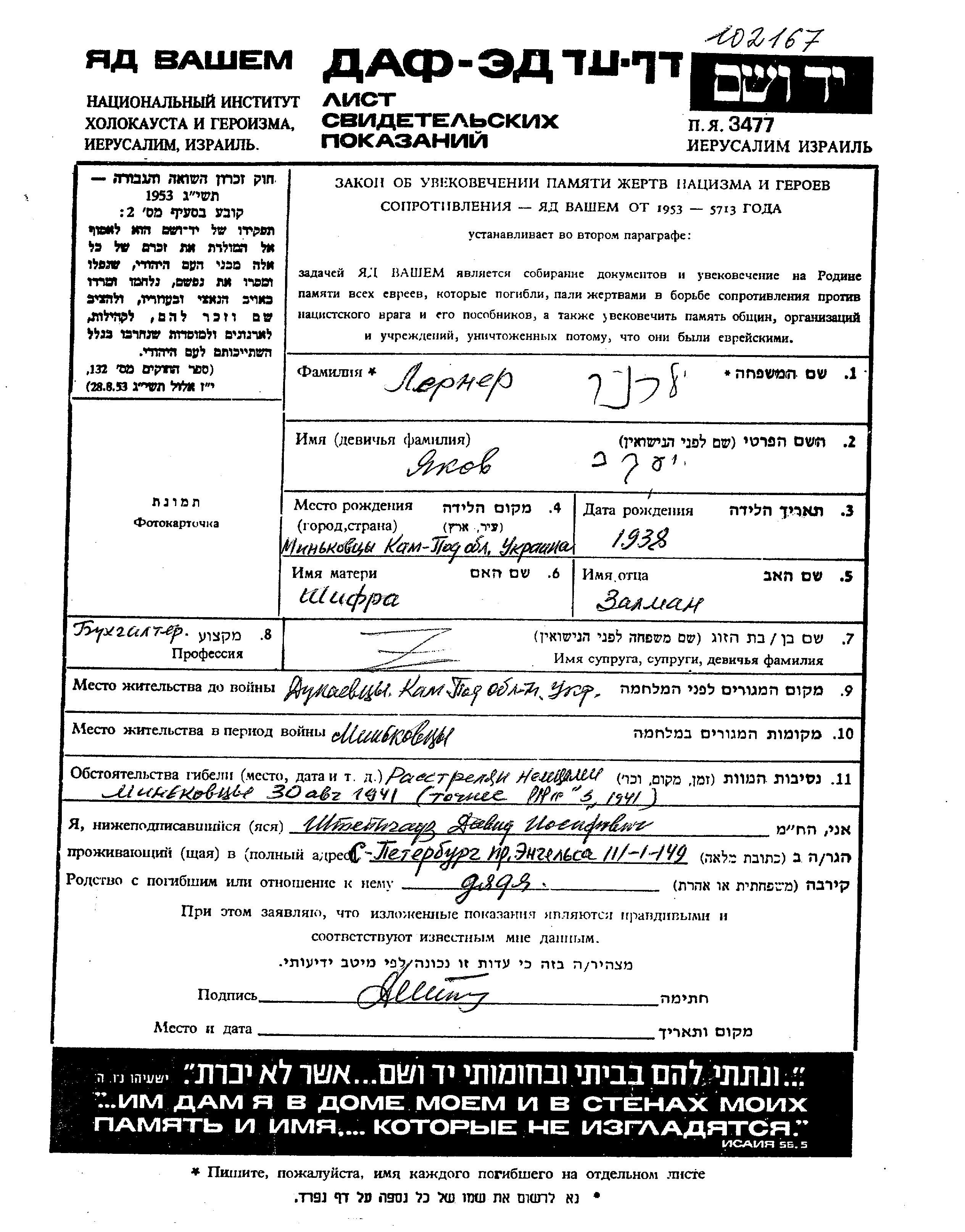 Lerner Yakov 1938 Dunayevtsy, Ukraine (UdSSR) Gedenkblatt