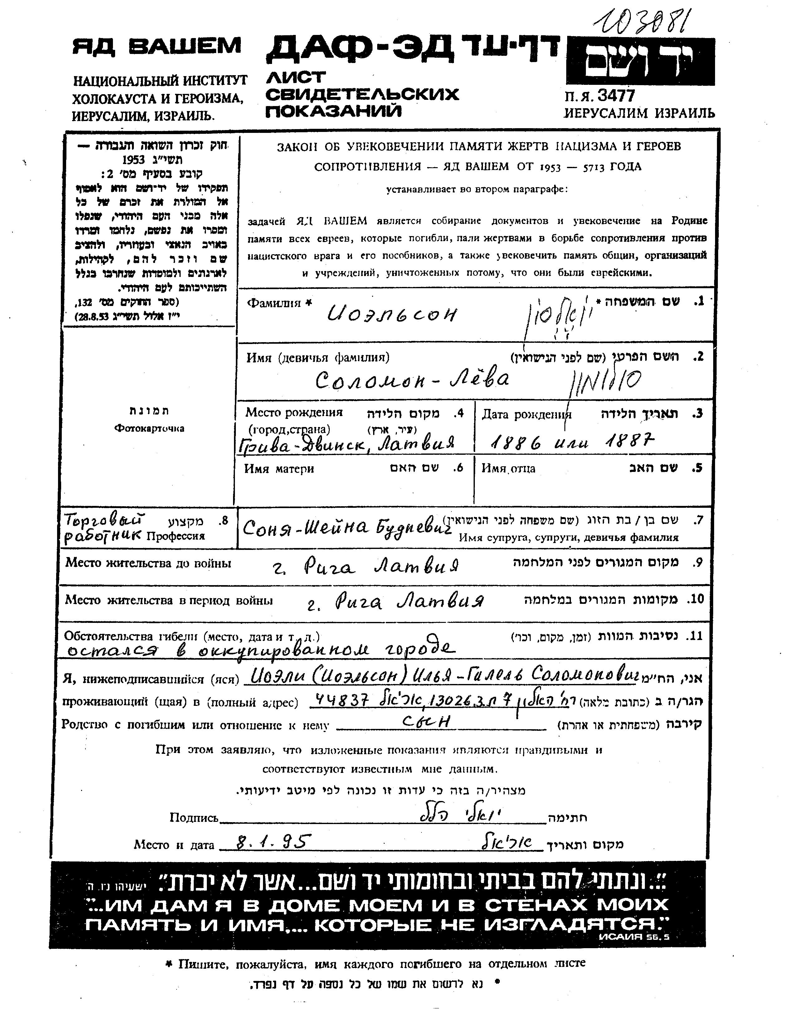 Solomon Lev Ioelson wurde im Jahr 1886 in Dvinsk, Lettland geboren. Er war Verkäufer/-in und mit Sonia Sheina Verheiratet. Vor dem Zweiten Weltkrieg lebte er in Riga, Lettland. Während des Krieges war er in Riga, Lettland.