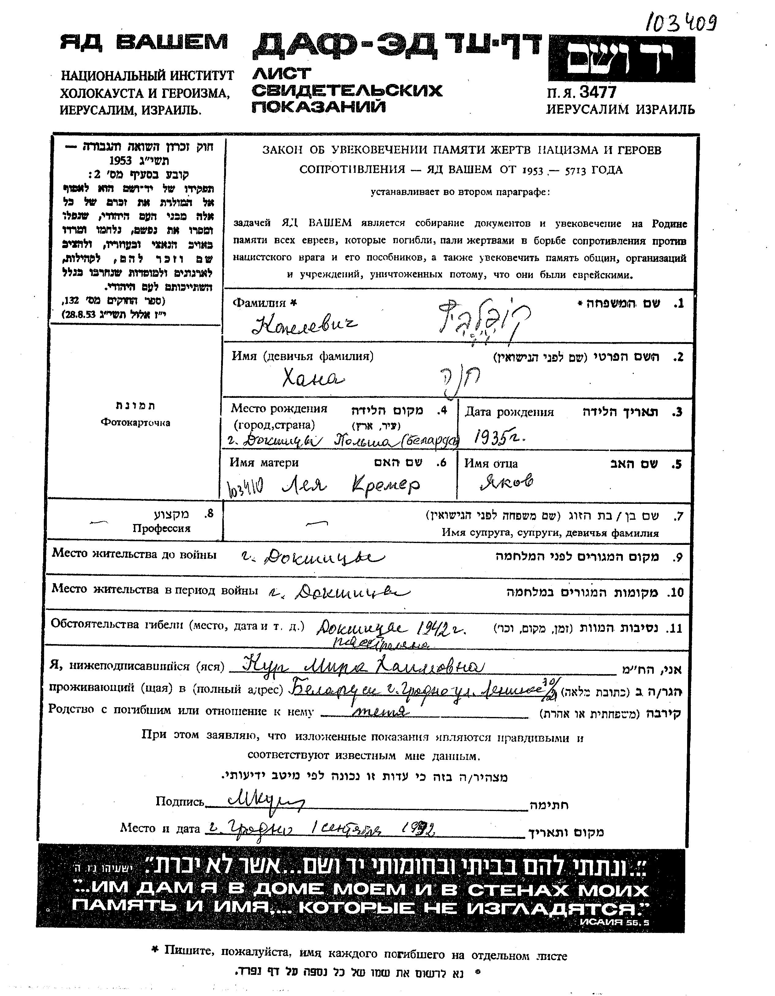 Khana Kopelevich wurde im Jahr 1935 in Dokszyce, Polen geboren. Sie war die Tochter von Yakov und Lea, geb. Kremer. Sie war Kind. Vor dem Zweiten Weltkrieg lebte sie in Dokszyce, Polen. Während des Krieges war sie in Dokszyce, Polen.