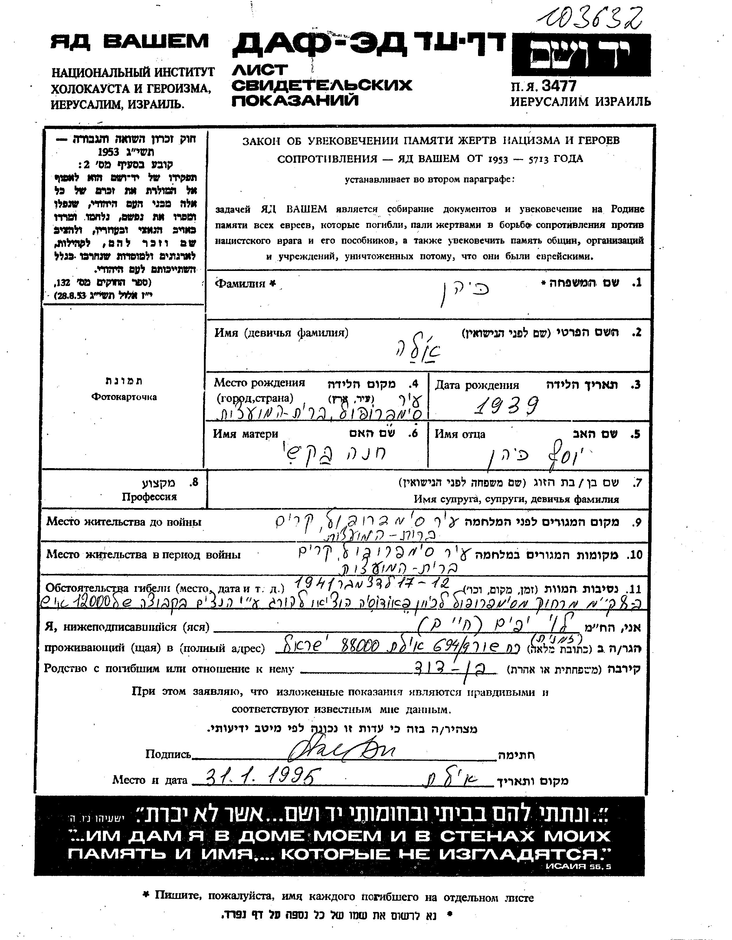 Ela Kohen wurde im Jahr 1939 in Karasubazar, Russland (UdSSR) geboren. Sie war die Tochter von Iosif und Khana, geb. Bakshi. Sie war Kind. Vor dem Zweiten Weltkrieg lebte sie in Simferopol, Russland (UdSSR). Während des Krieges war sie in Simferopol, Russland (UdSSR).