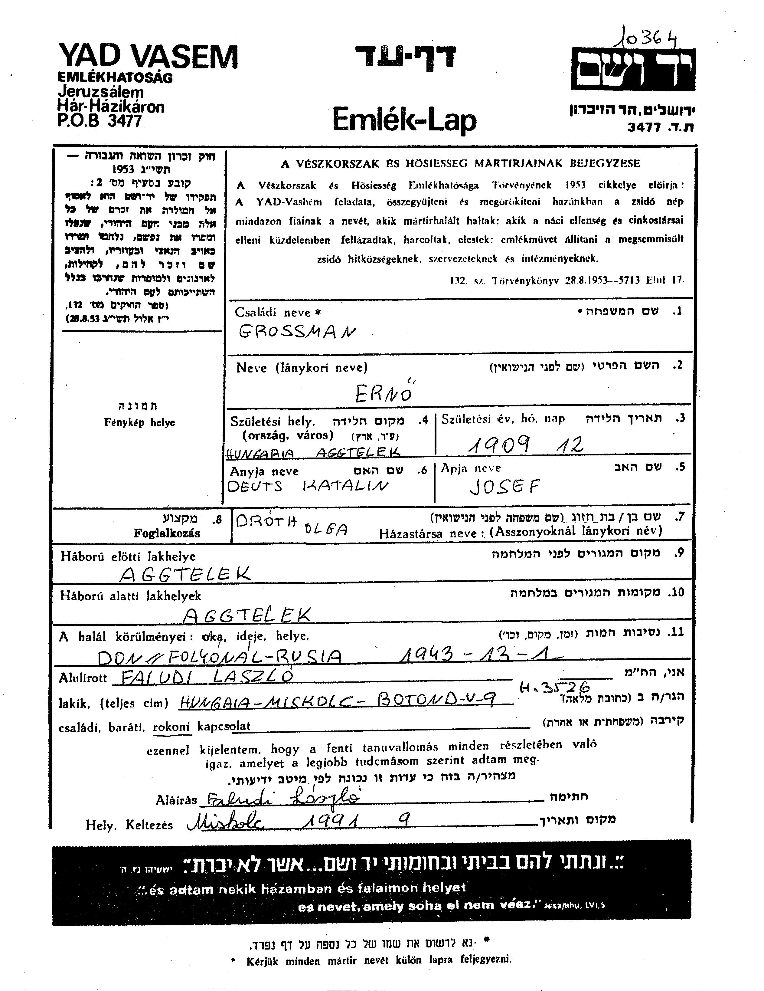 Erno Grossmann wurde im Jahr 1909 in Aggtelek, Ungarn geboren. Er war der Sohn von Josef und Katalin, geb. Deuts. Er war mit Olga Verheiratet. Vor dem Zweiten Weltkrieg lebte er in Aggtelek, Ungarn. Während des Krieges war er in Aggtelek, Ungarn.