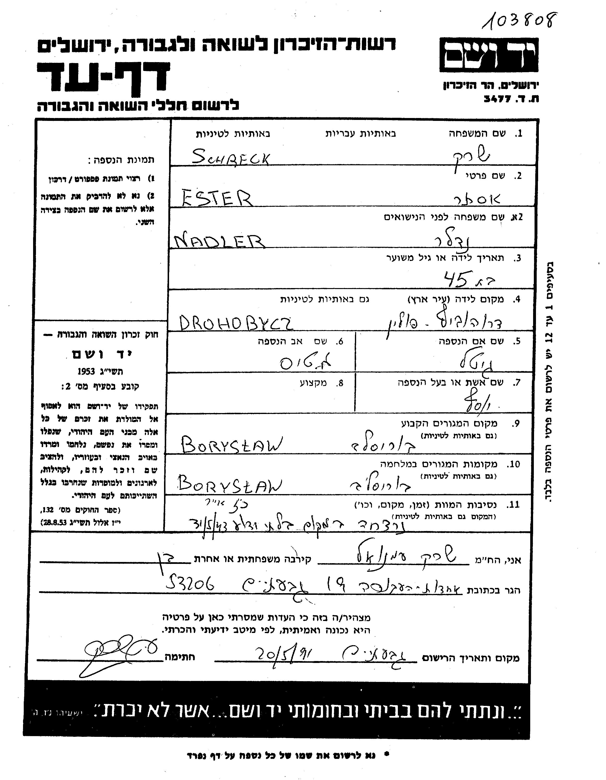 Ester Schrek, geb. Nadler wurde in Drohobycz, Polen geboren. Sie war die Tochter von Matis und Gitel. Sie war mit Josef Verheiratet. Vor dem Zweiten Weltkrieg lebte sie in Boryslaw, Polen. Während des Krieges war sie in Boryslaw, Polen.