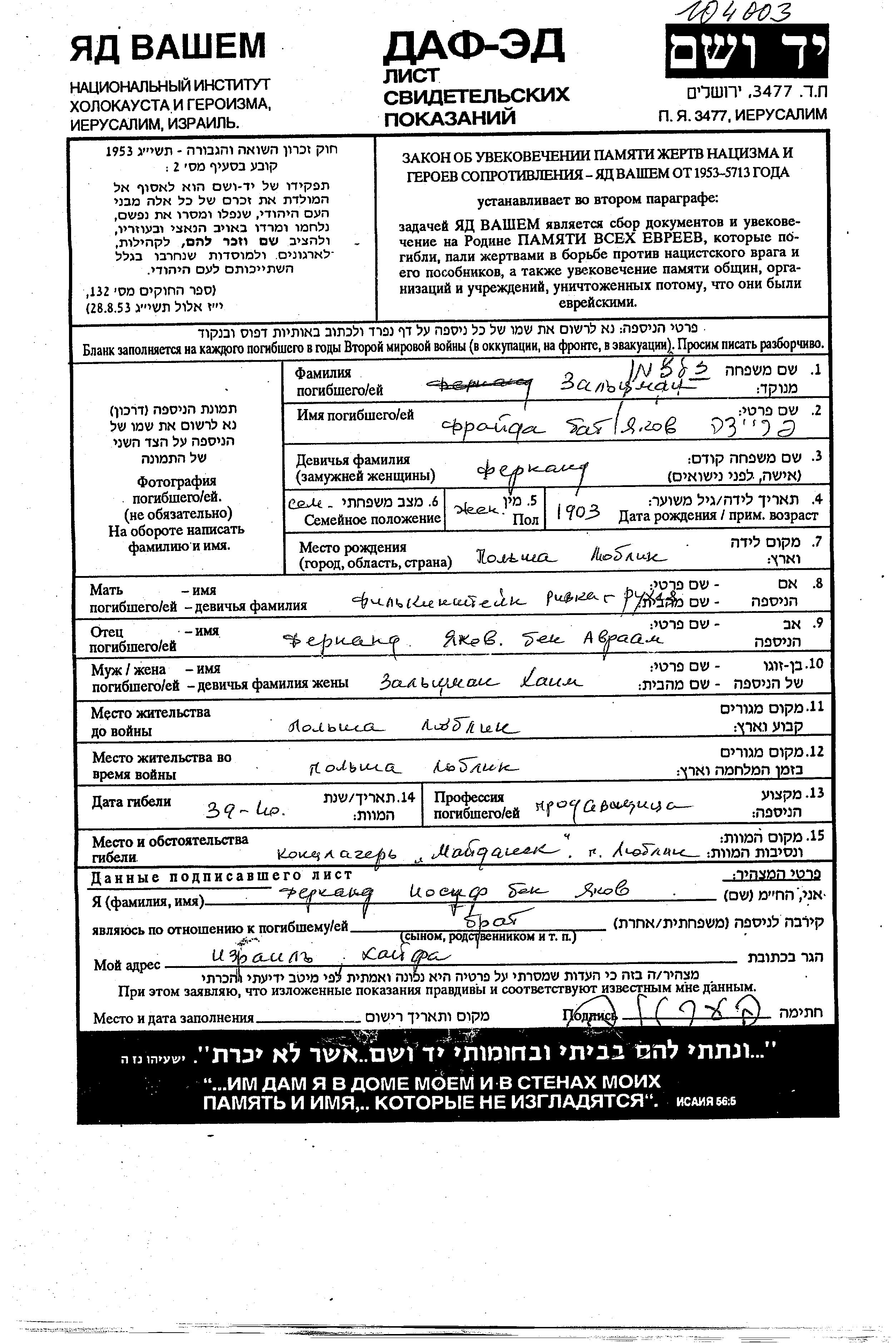 Zaltzman Freida 1903 Lublin, Polen Gedenkblatt