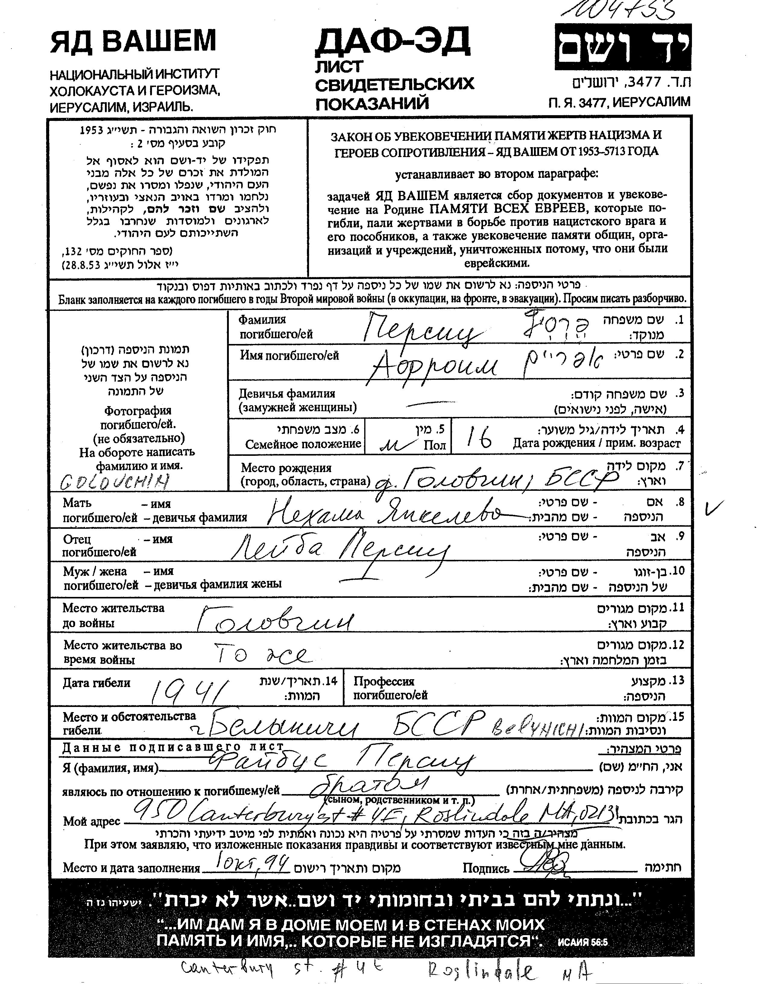 Afroim Persitz wurde im Jahr 1925 in Golovchin, Weißrussland (UdSSR) geboren. Er war der Sohn von Leiba und Nekhama, geb. Yankeleva. Er war Kind. Vor dem Zweiten Weltkrieg lebte er in Golovchin, Weißrussland (UdSSR). Während des Krieges war er in Golovchin, Weißrussland (UdSSR).
