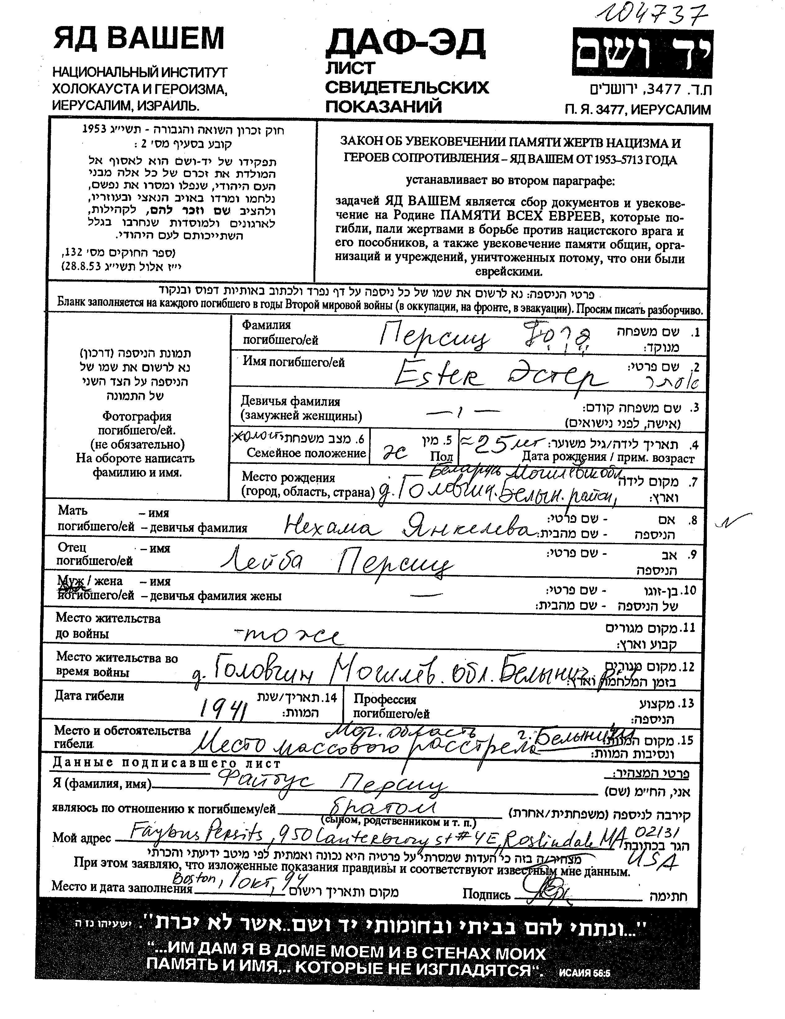 Ester Persitz wurde im Jahr 1916 in Golovchin, Weißrussland (UdSSR) geboren. Sie war die Tochter von Leiba und Nekhama, geb. Yankeleva. Sie war Ledig. Vor dem Zweiten Weltkrieg lebte sie in Golovchin, Weißrussland (UdSSR). Während des Krieges war sie in Golovchin, Weißrussland (UdSSR).