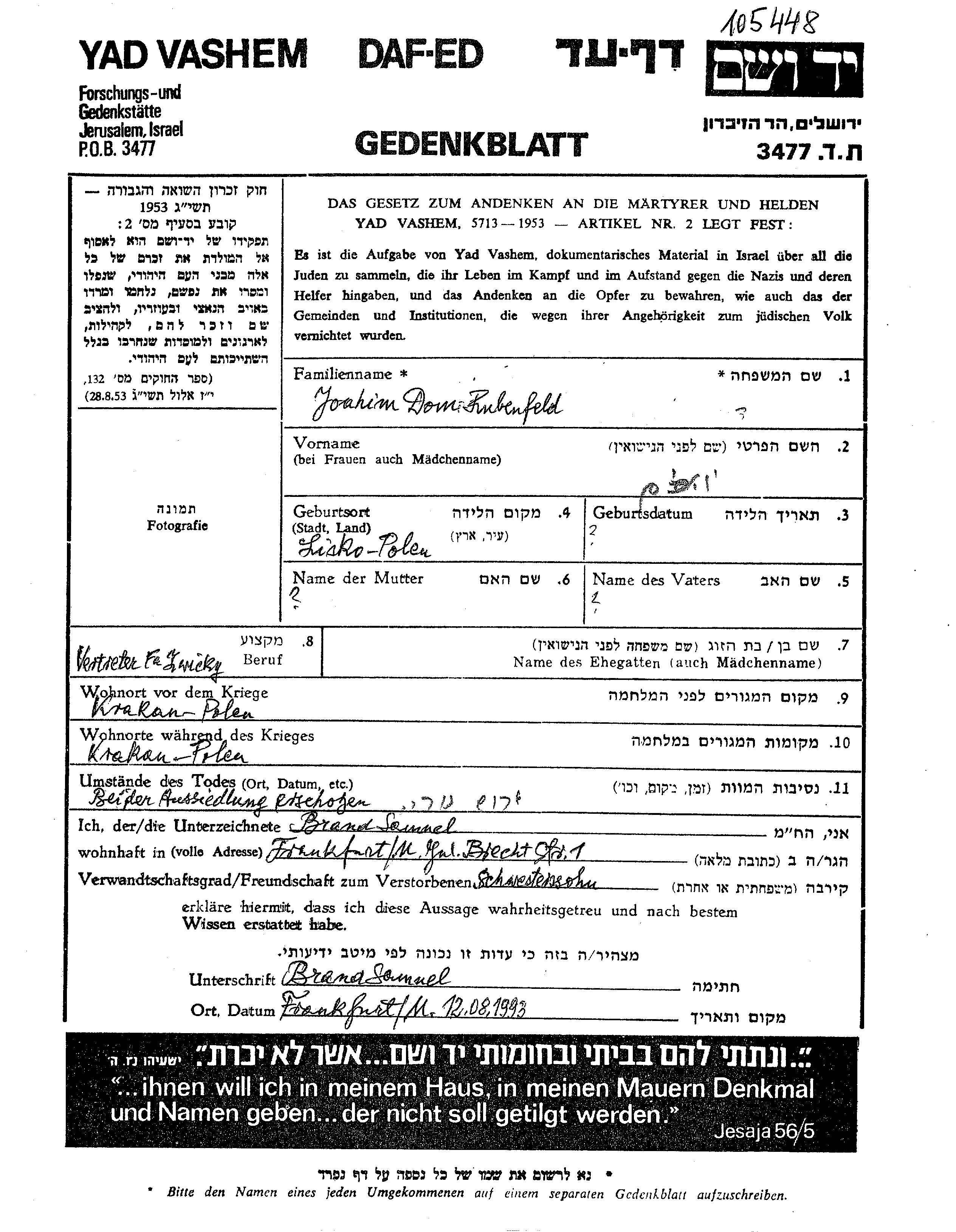 Joahim Domb Rubenfeld wurde in Lisko, Polen geboren. Er war Vertreter/-in. Vor dem Zweiten Weltkrieg lebte er in Lisko, Polen. Während des Krieges war er in Lisko, Polen.
