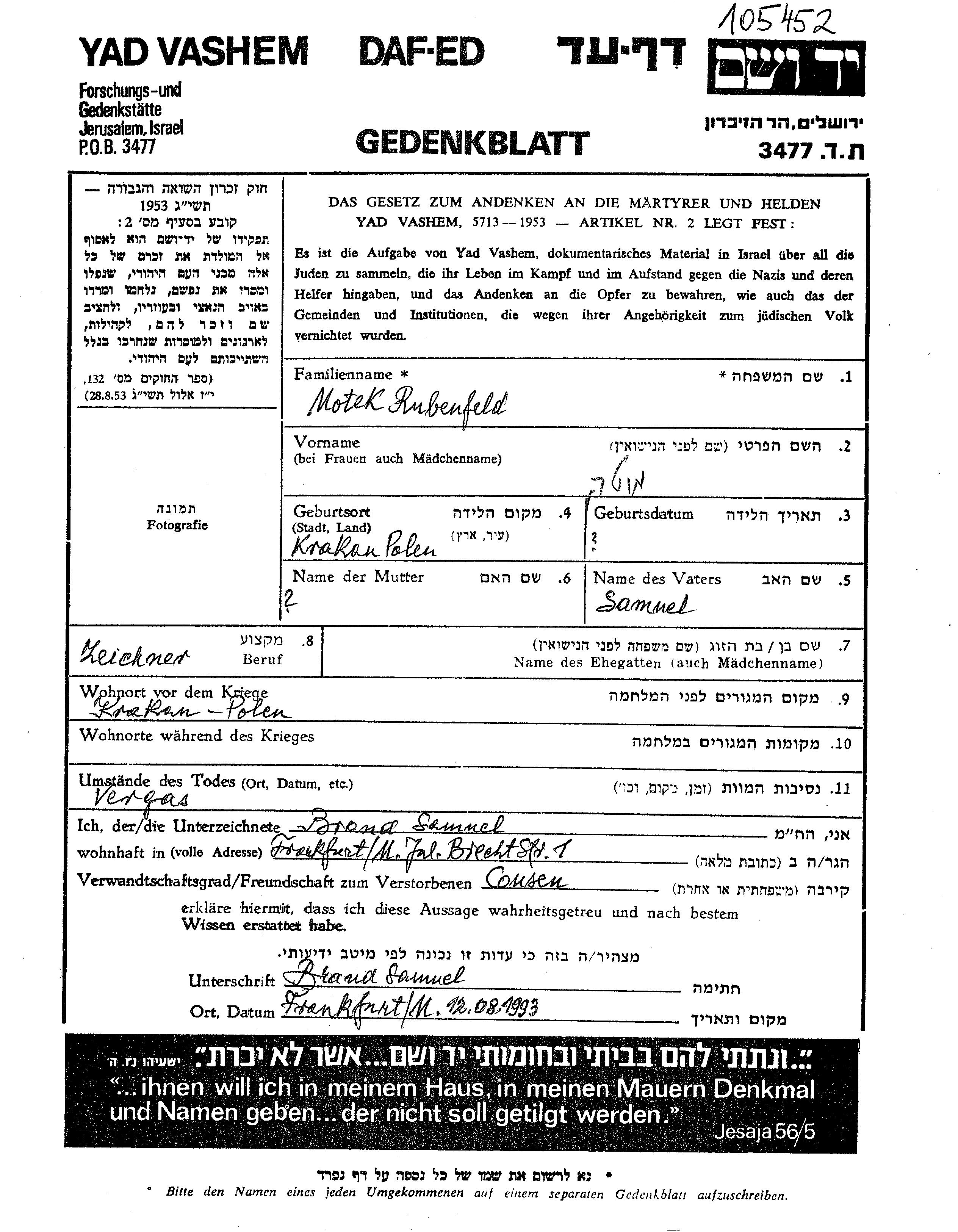 Rubenfeld Motek Krakow, Polen Gedenkblatt