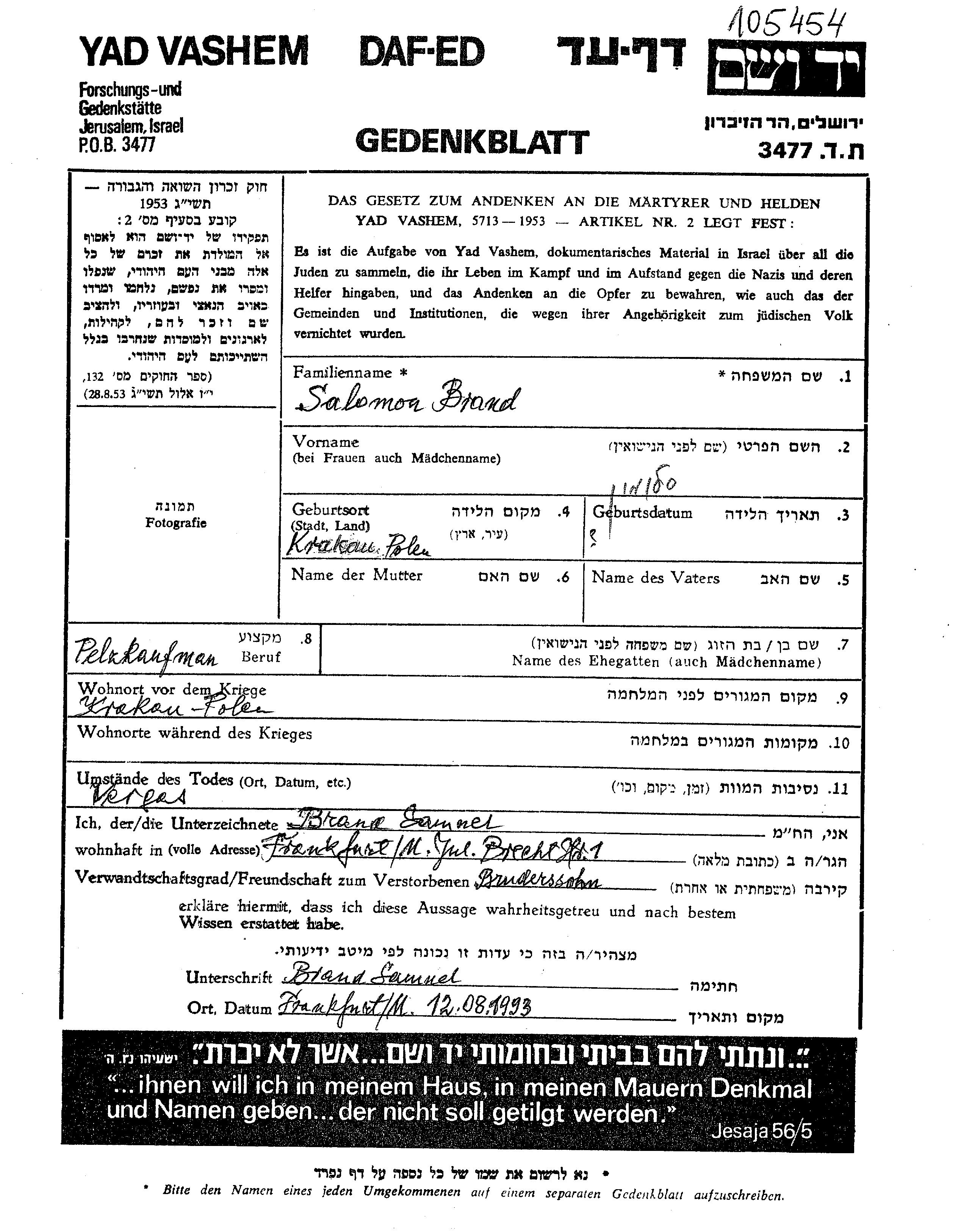 Salomon Brand wurde in Krakow, Polen geboren. Er war Kaufmann/-frau. Vor dem Zweiten Weltkrieg lebte er in Krakow, Polen.