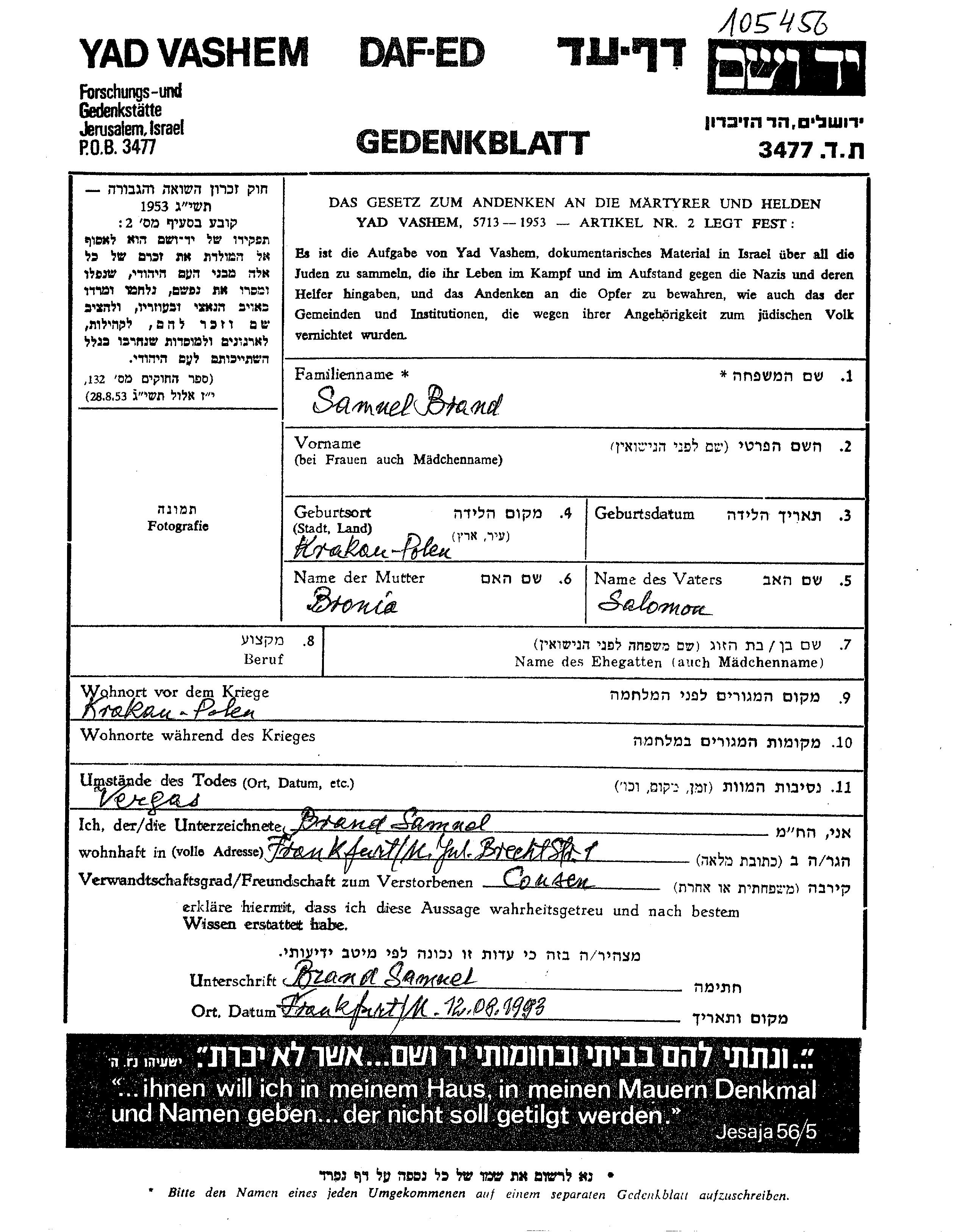 Samuel Brand wurde in Krakow, Polen geboren. Er war der Sohn von Salomon und Bronia. Vor dem Zweiten Weltkrieg lebte er in Krakow, Polen.