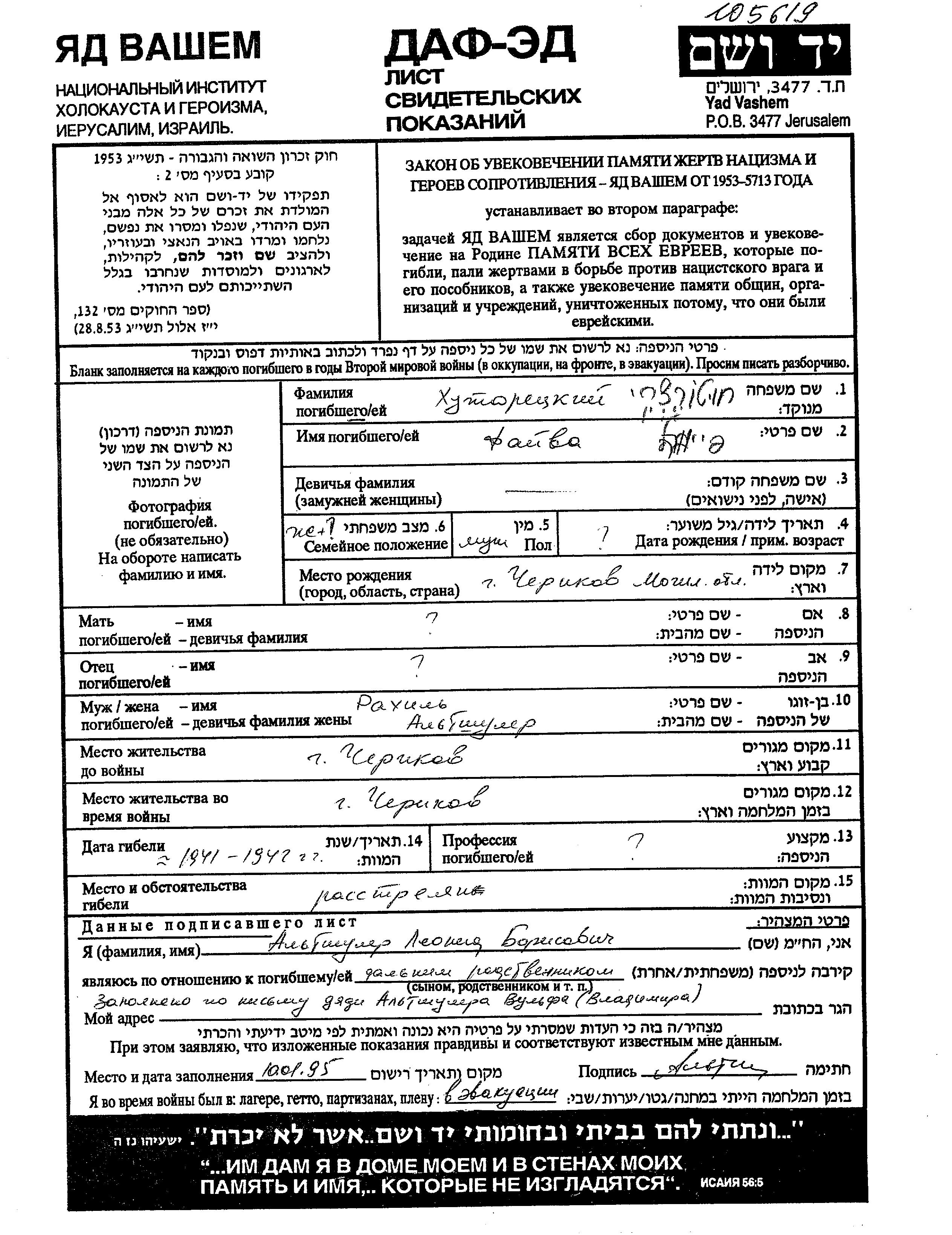 Faiva Khutoretzki wurde in Cherikov, Weißrussland (UdSSR) geboren. Er war mit Rakhil Verheiratet. Vor dem Zweiten Weltkrieg lebte er in Cherikov, Weißrussland (UdSSR). Während des Krieges war er in Cherikov, Weißrussland (UdSSR).