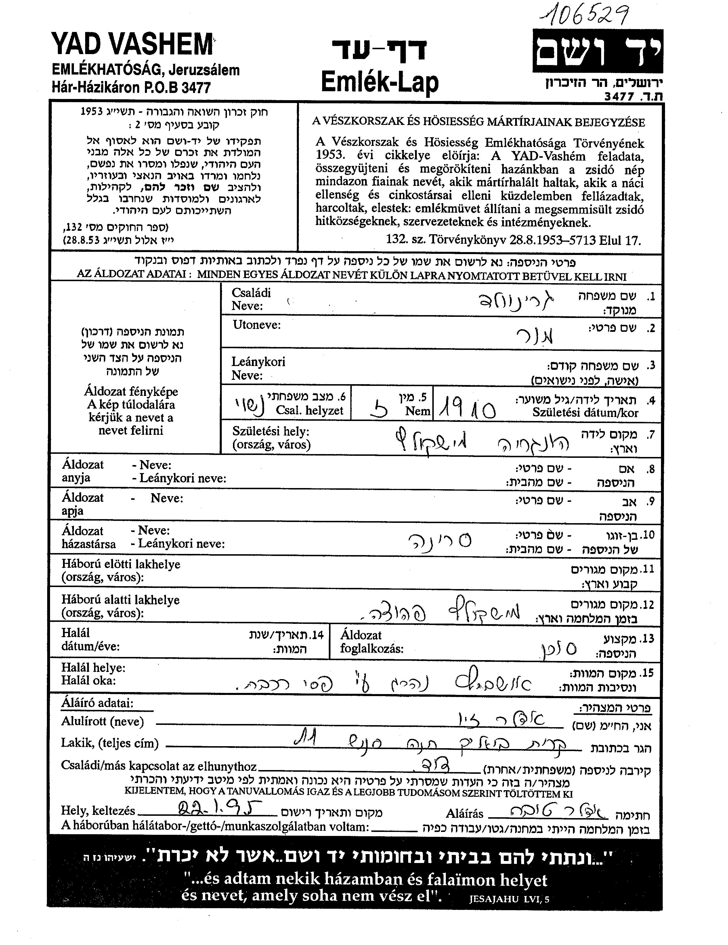 Mor wurde in der Schoah ermordet. Todesort: Auschwitz, Polen.