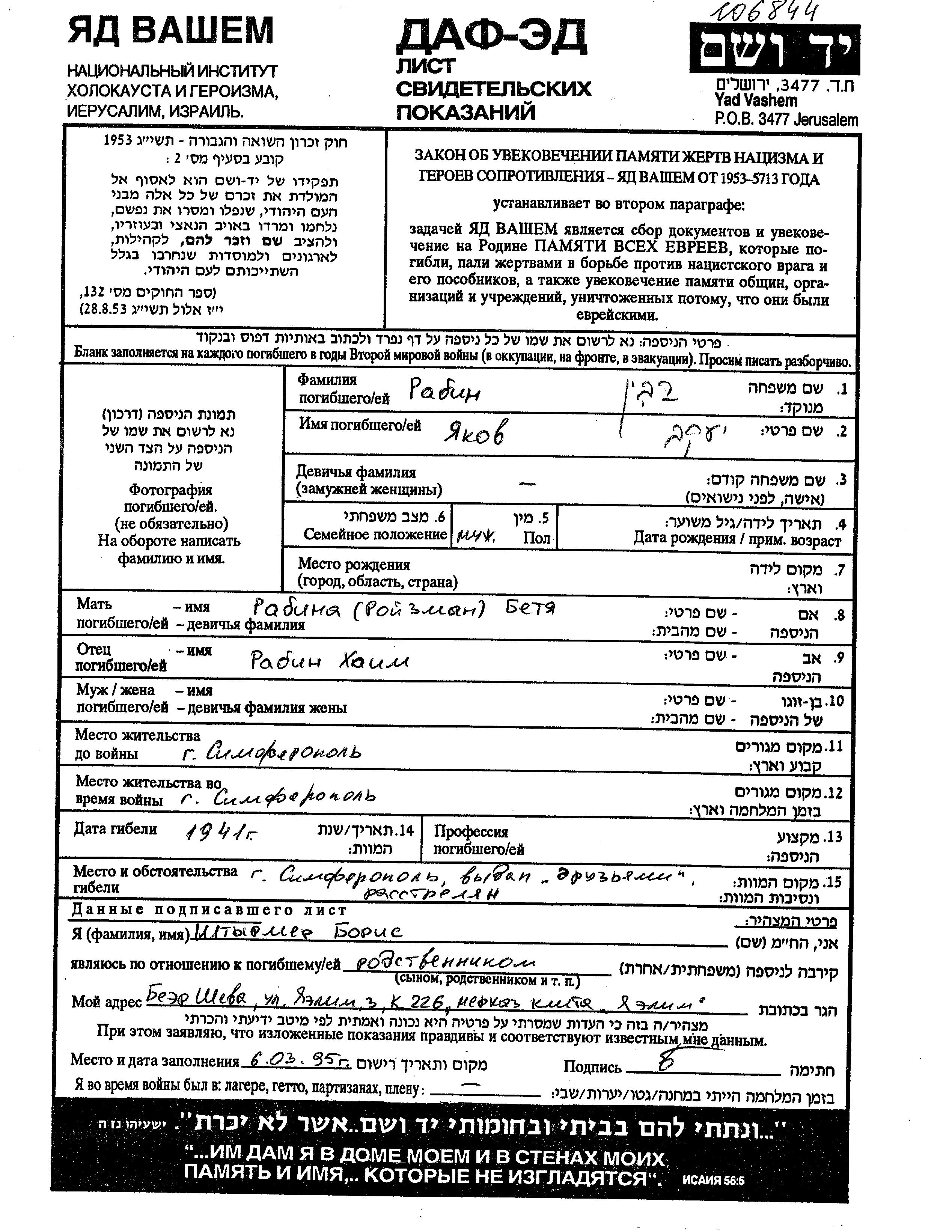 Yakov Rabin wurde Er war der Sohn von Khaim und Betia, geb. Roizman. Vor dem Zweiten Weltkrieg lebte er in Simferopol, Russland (UdSSR). Während des Krieges war er in Simferopol, Russland (UdSSR).