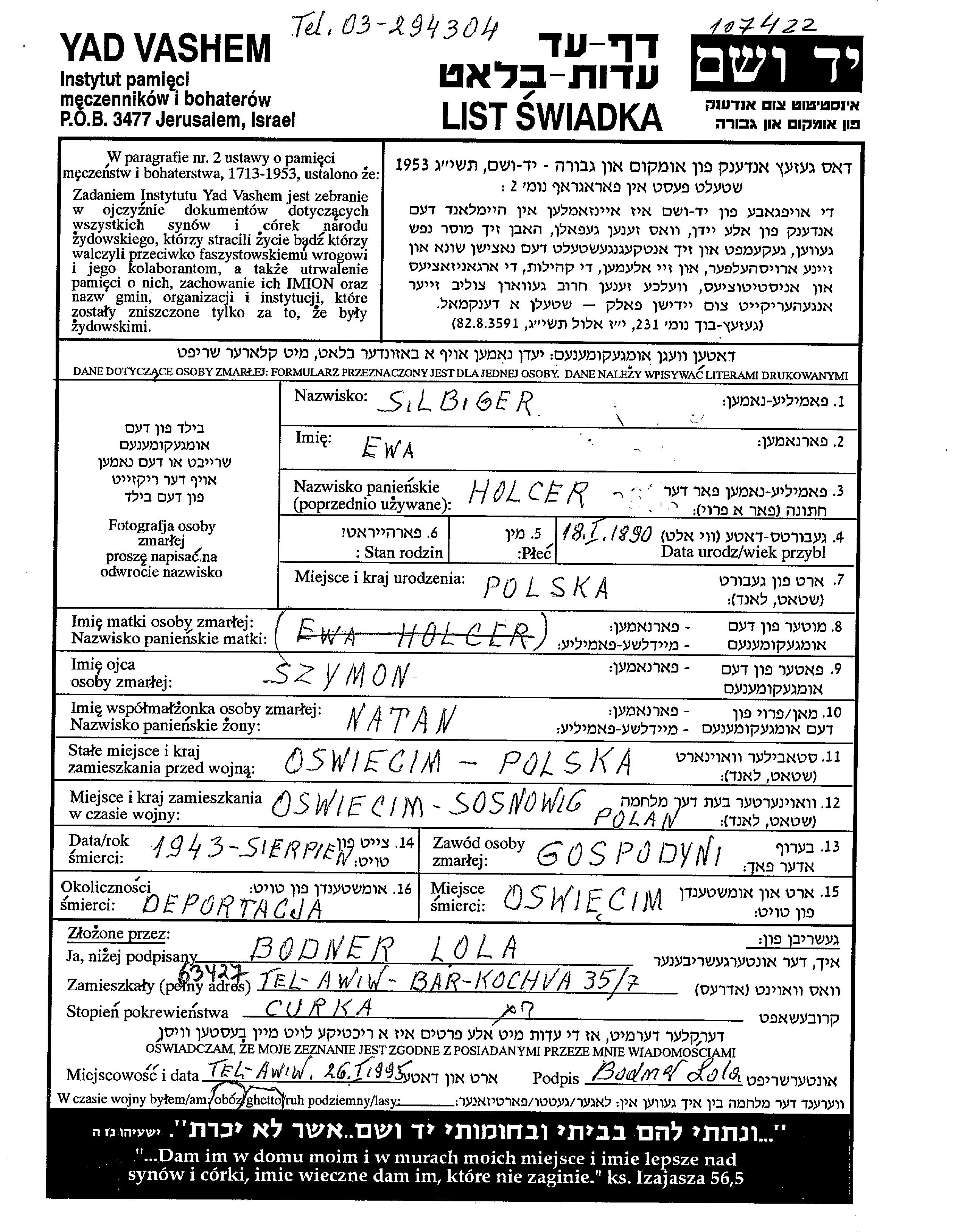 Ewa Silbiger, geb. Holcer wurde im Jahr 1890 in Polen geboren. Sie war die Tochter von Szymon. Sie war Hausfrau und mit Natan Verheiratet. Vor dem Zweiten Weltkrieg lebte sie in Oświęcim, Polen. Während des Krieges war sie in Oświęcim, Polen.